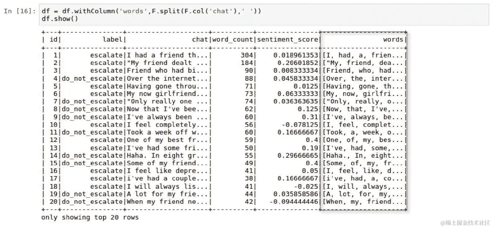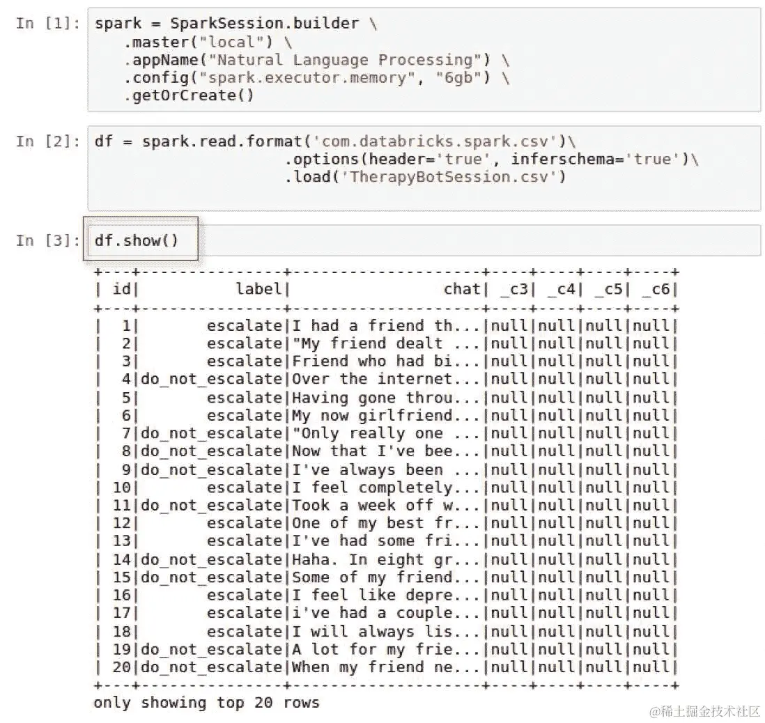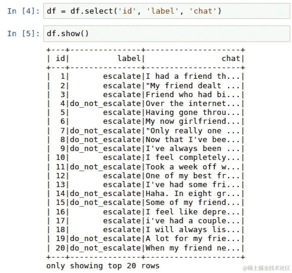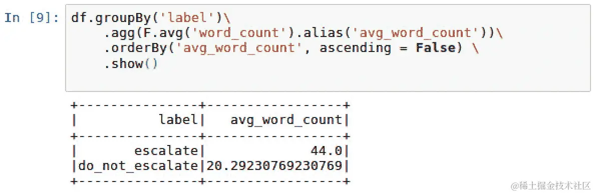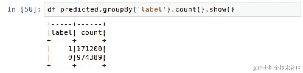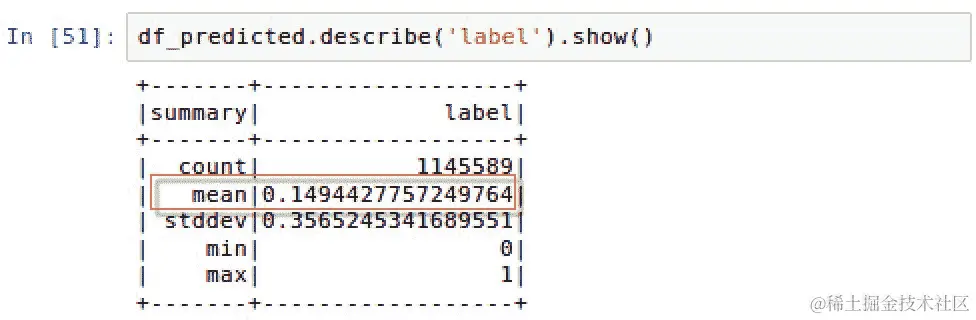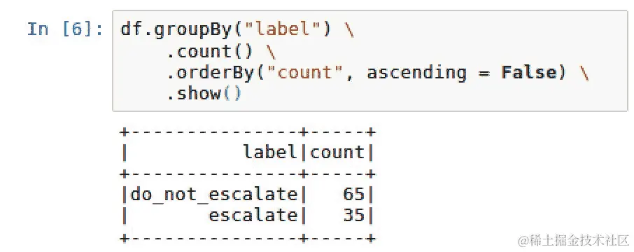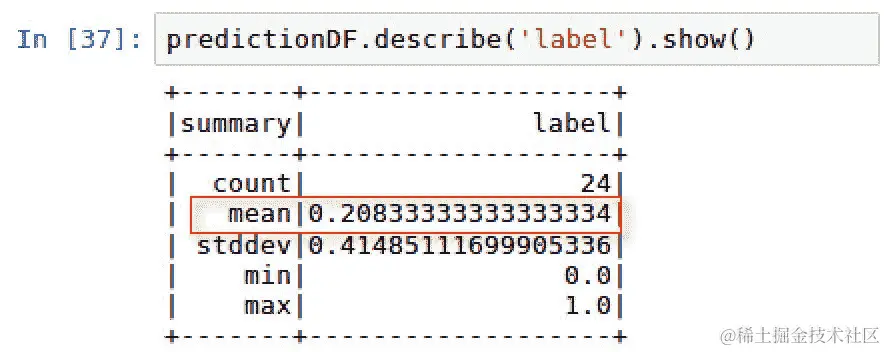 chat对话都被标记为do_not_escalate或反之亦然,我们是否会有高于 91.7%的基准准确率?找出这一点最简单的方法是使用以下脚本在predictionDF的label列上运行describe()方法:predictionDF.describe('label').show() -