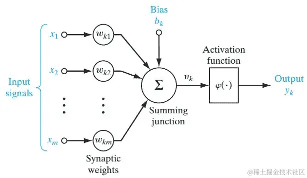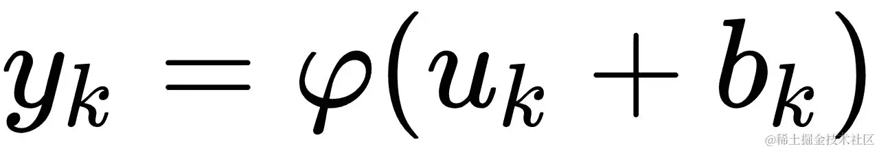 激活函数:在人工神经网络中,节点的激活函数决定了节点在给定输入或一组输入时产生的输出类型。输出*y[k]由输入u[k]和偏置b[k]通过激活函数φ(.)*得到,如下式所示: