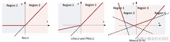 Maxout、ReLU 和 PReLU 函数的图形比较