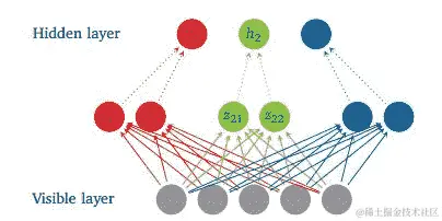 前面的图表显示了具有五个可见单元、三个隐藏单元和每个隐藏单元两个神经元的 Maxout 网络。Maxout 函数由以下方程给出: