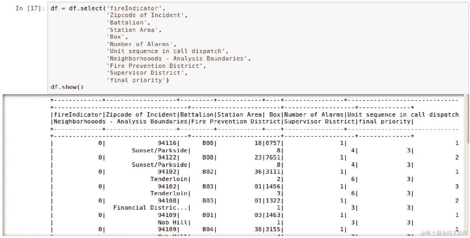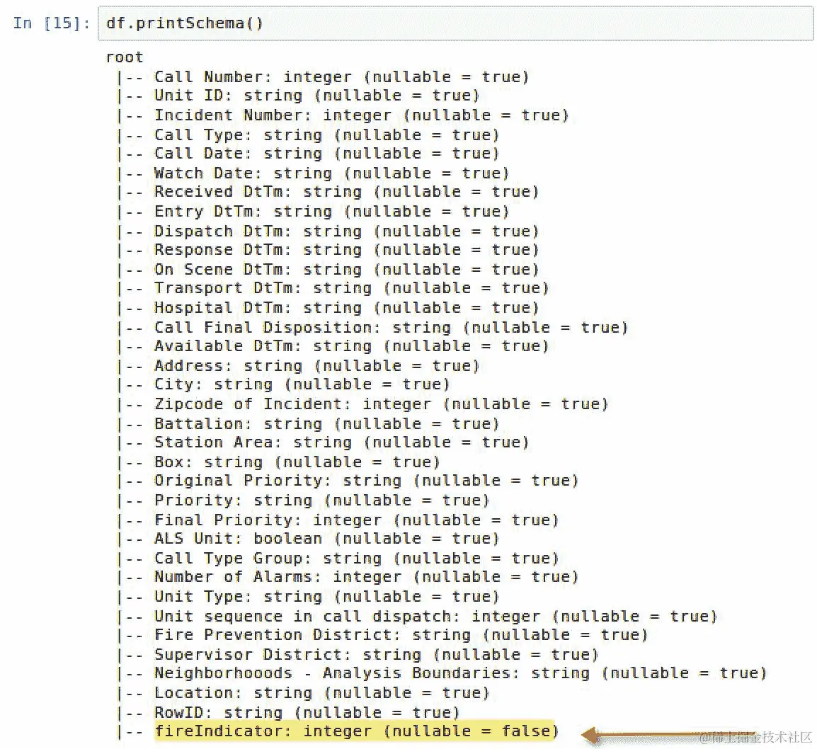 trainingDF上进行训练和拟合,然后创建一个新的数据框predictionDF,其中包含新转换的字段prediction,如下截图所示: