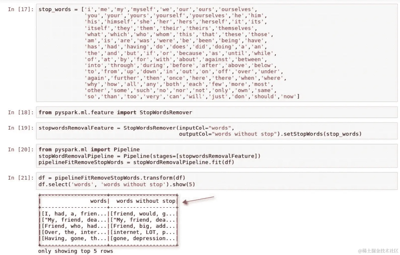 pipeline.fit(df)用于生成名为pipelineFitRemoveStopWords的转换器函数。最后,在数据框上调用transform(df)函数,以生成具有名为words without stop的新列的更新后的数据框。我们可以将两列并排比较以查看差异,如下截屏所示: