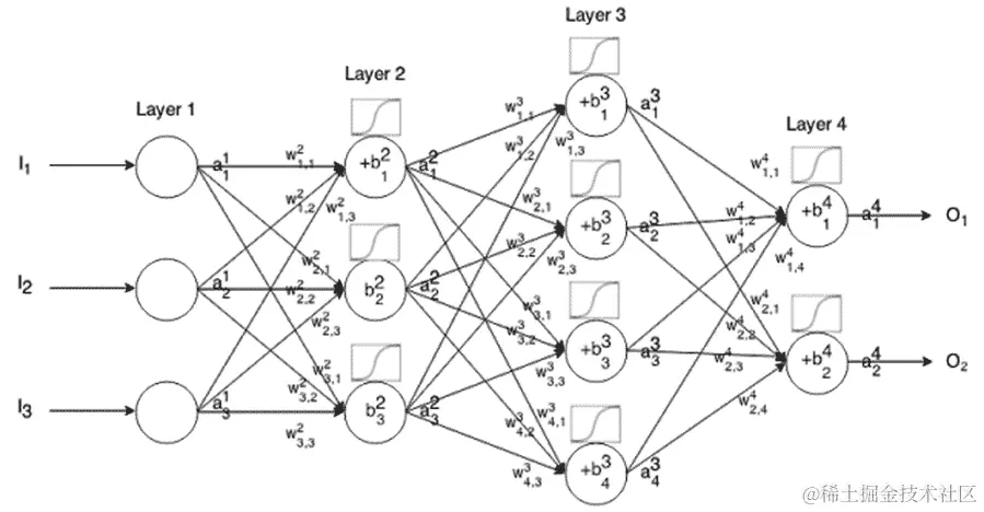 在神经网络的各层中的每个神经元/节点上执行一系列矩阵运算。下图以更数学化的方式展示了前馈网络,这将帮助您更好地理解每个节点/神经元的操作:
