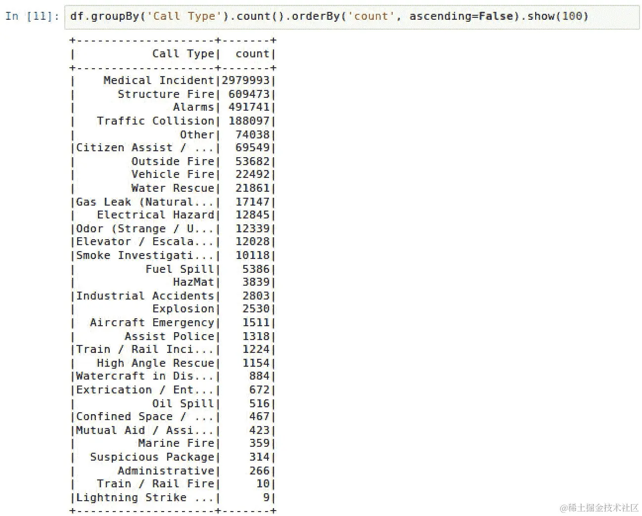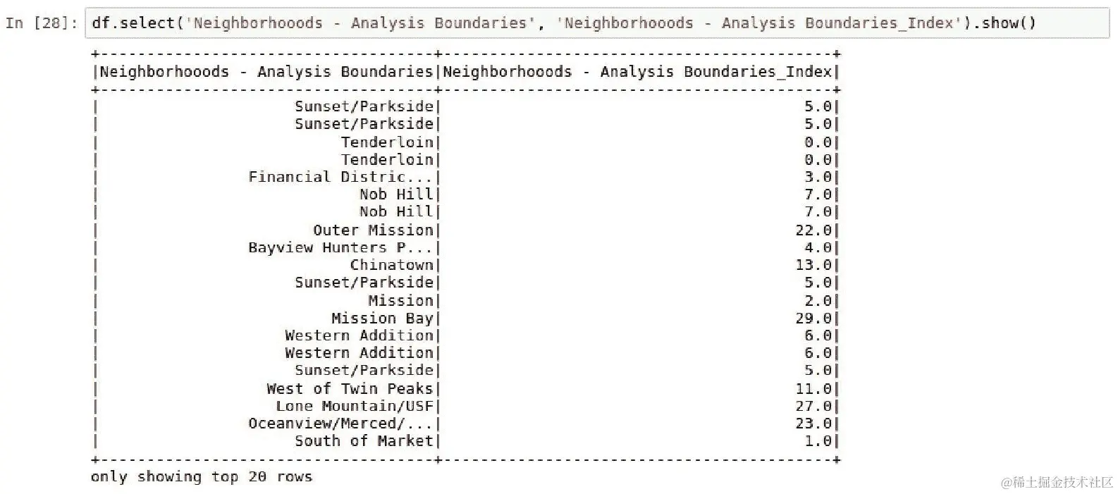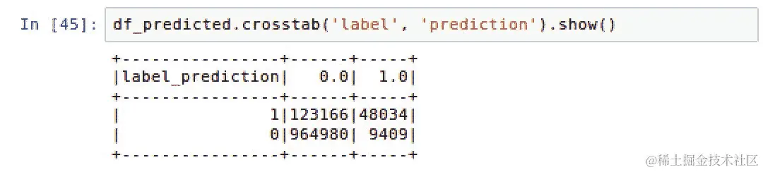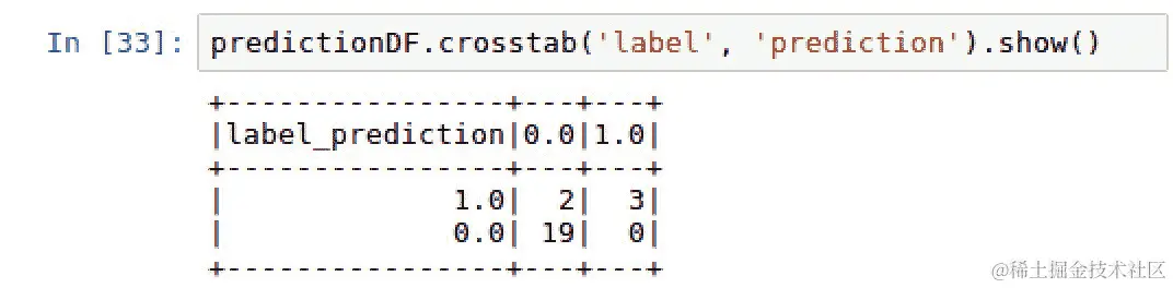 predictionDF.crosstab('label', 'prediction').show()。脚本的输出可以在以下截图中看到: