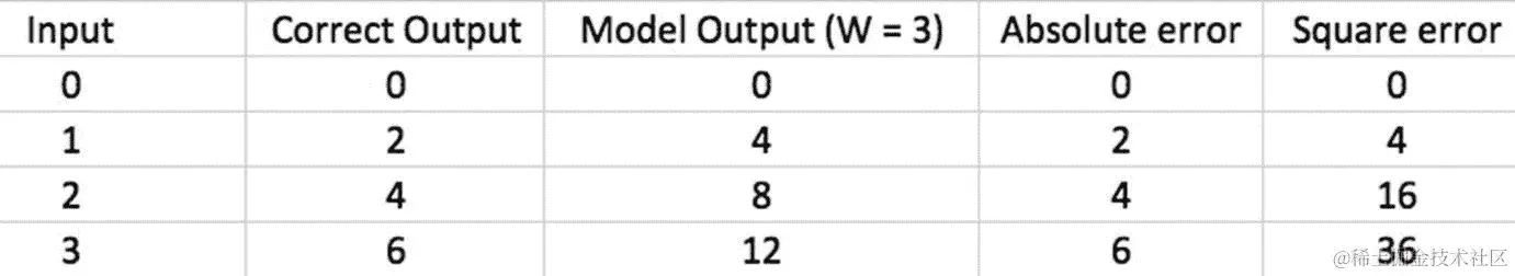 误差是通过将正确输出的列减去模型输出的列来计算的。平方误差实际上就是每个误差项与自身相乘。通常最好使用平方误差,因为它消除了误差项中的负值。