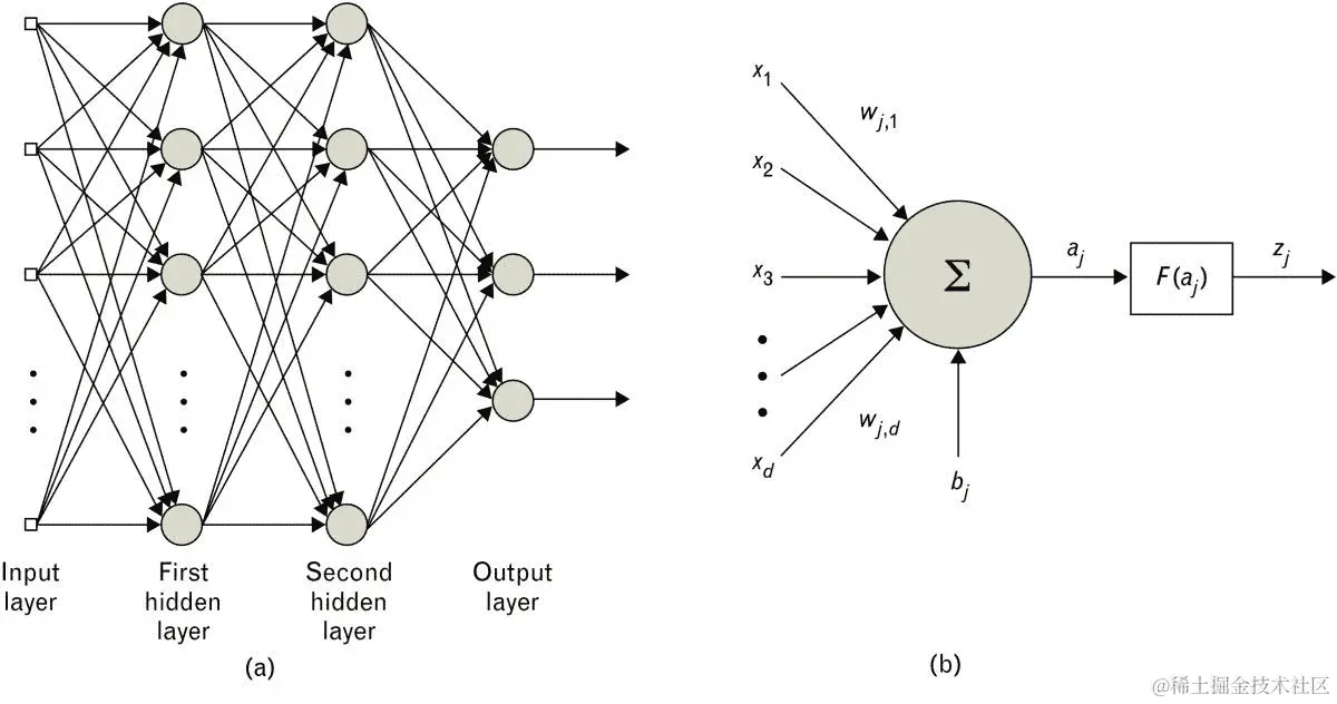- 下图(a)显示了前馈神经网络中节点如何相互连接: