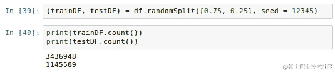 (trainingDF, testDF) = df.randomSplit([0.75, 0.25], seed = 1234)