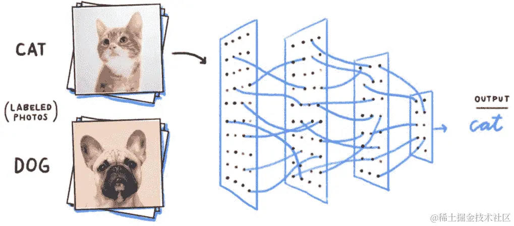 - 假设我们的前馈网络已经训练好,可以对狗和猫的图像进行分类。一旦网络训练好,如下图所示,它将学会在呈现新图像时将图像标记为狗或猫: