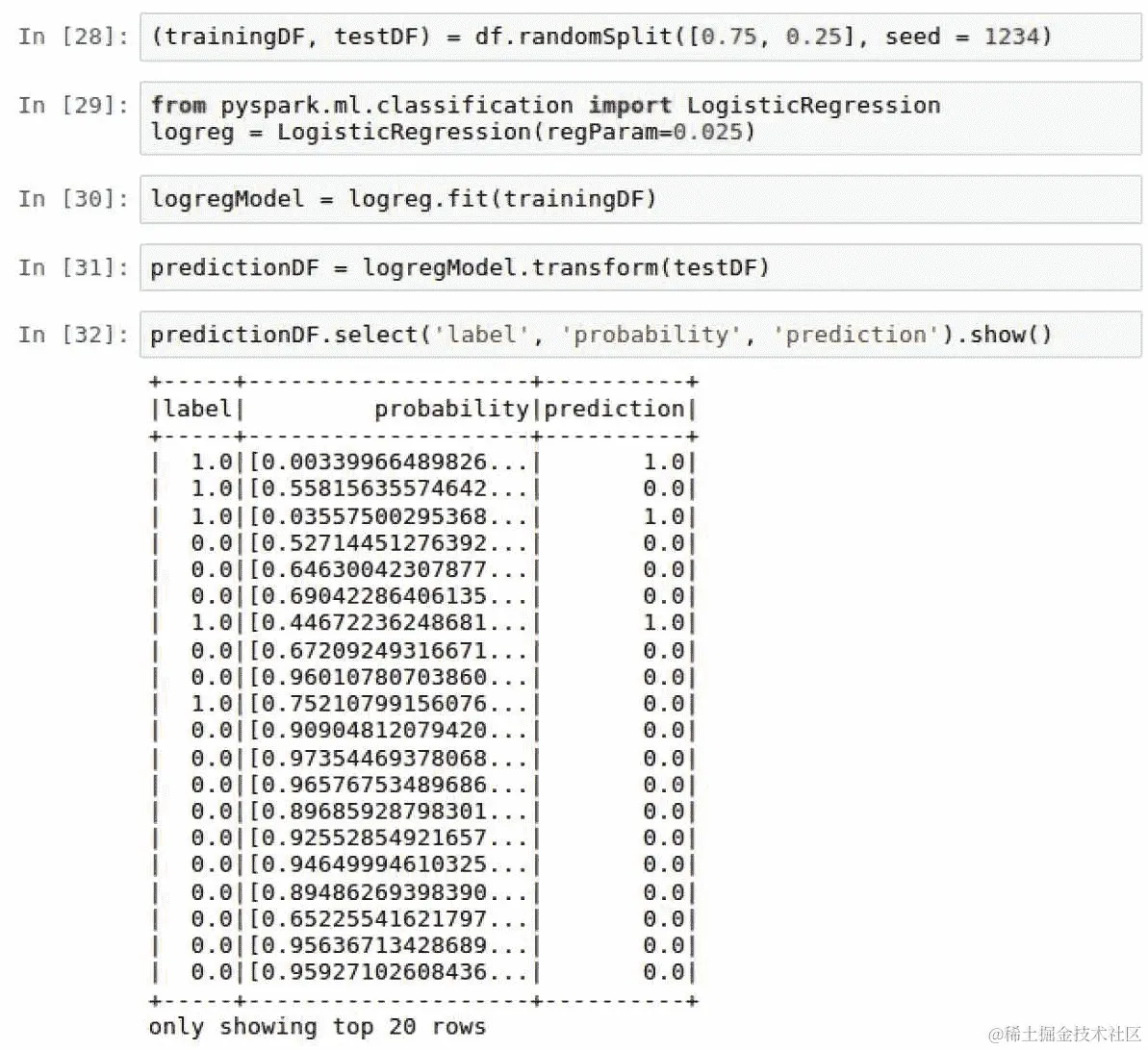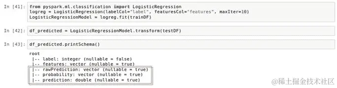 logreg拟合到训练数据框trainingDF上。基于逻辑回归模型的transform()方法,创建一个新的数据框predictionDF,如下脚本所示: