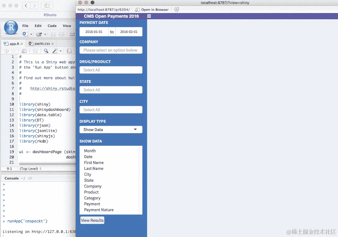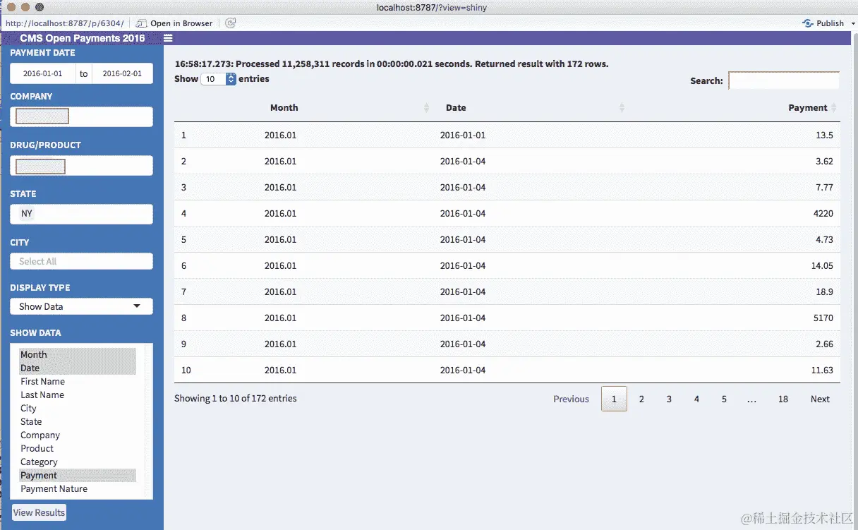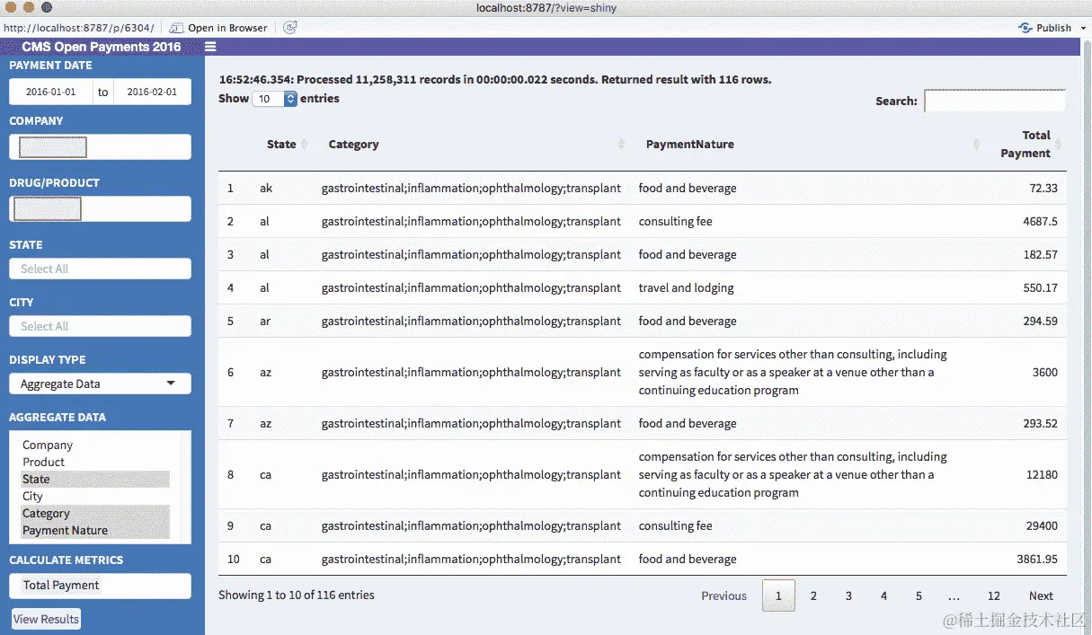 我们现在已经完成了开发一个完整的 CMS Open Payments 应用程序,允许最终用户过滤、聚合和分析数据。现在,您可以通过在屏幕上选择各种选项来运行查询。应用程序有两个功能: