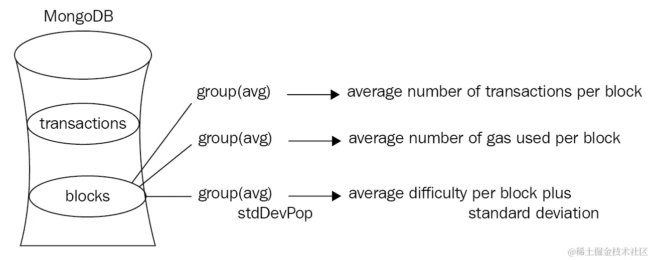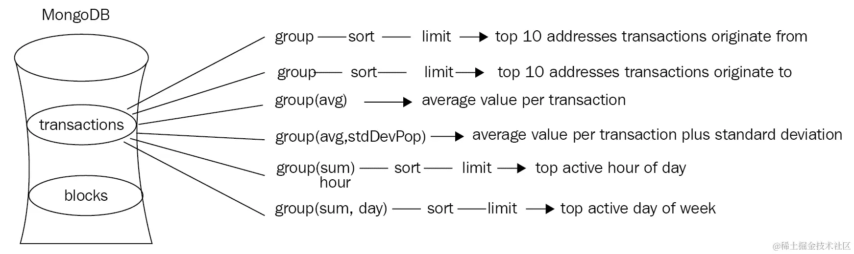 为了了解这些信息,我们将使用聚合来处理以太坊区块链的交易数据。完整的源代码可在github.com/PacktPublishing/Mastering-MongoDB-4.x-Second-Edition上找到。