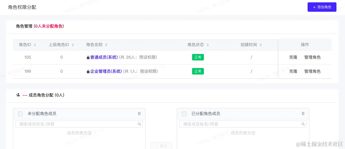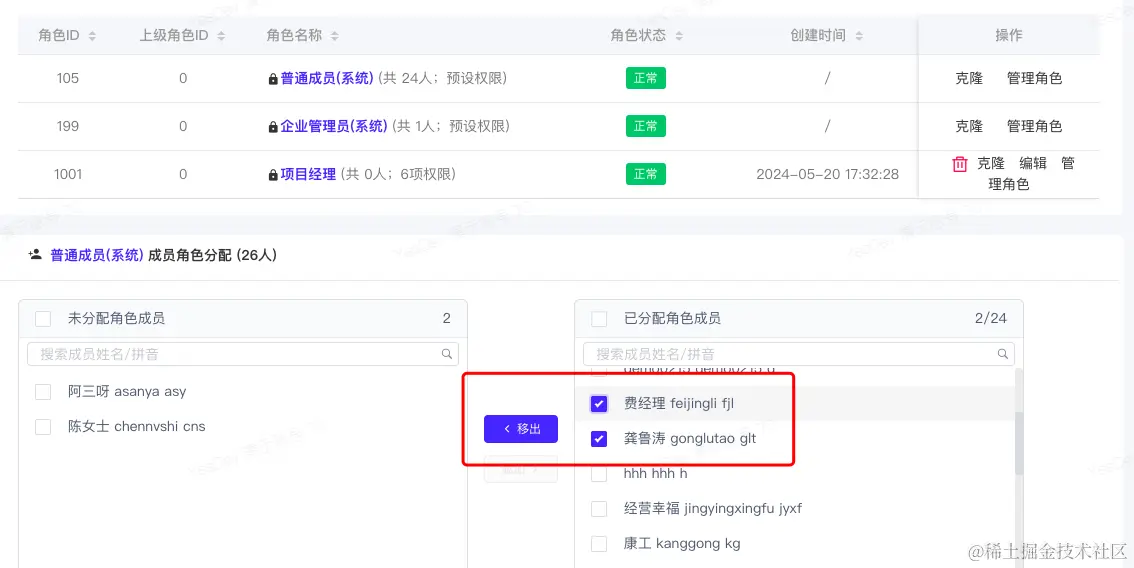 选择 角色 后,点击【管理角色】,在【成员角色分配】组件,可以将此角色权限分配给多个员工。