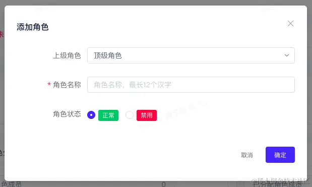 点击【+ 添加角色】,在 添加角色 弹窗,选择或输入:上级角色、角色名称、角色状态。其中: