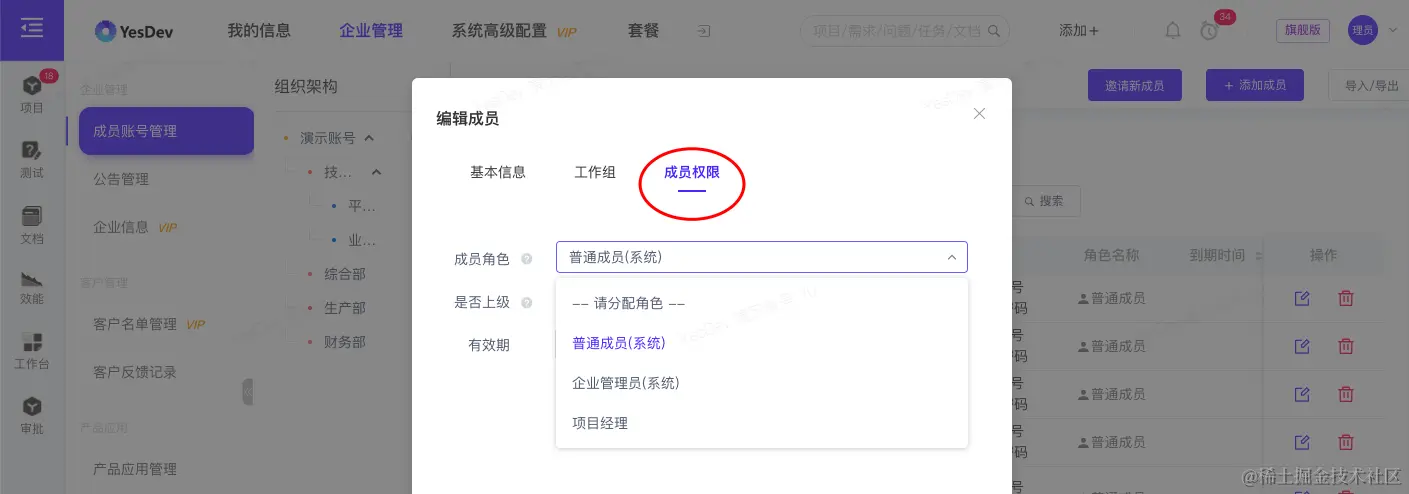 温馨提示:【普通成员】和【企业管理员】是属于YesDev系统预设的系统角色,不可删除、编辑。