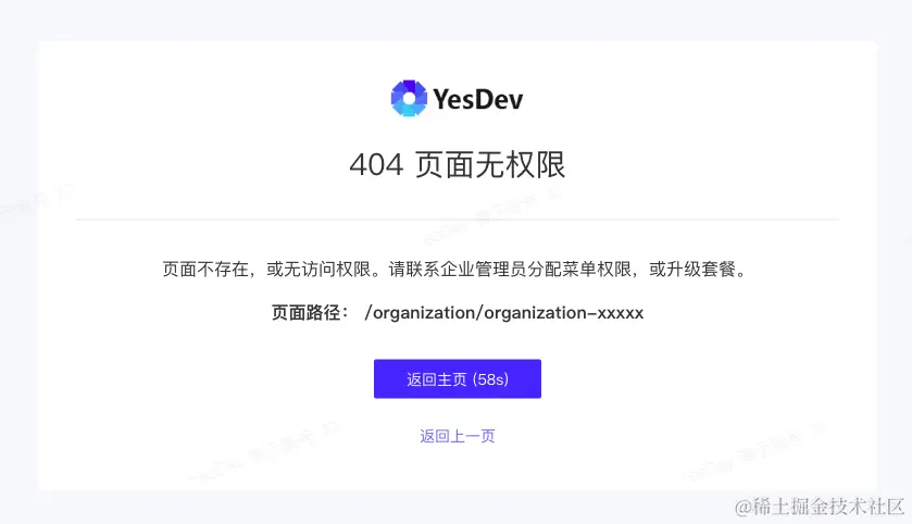 若员工没有页面菜单权限,访问时,将会提示:404 页面无权限。例如: