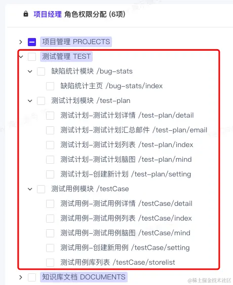 其中,【测试管理 TEST】展开后,有类似以下的层级菜单 可分配: