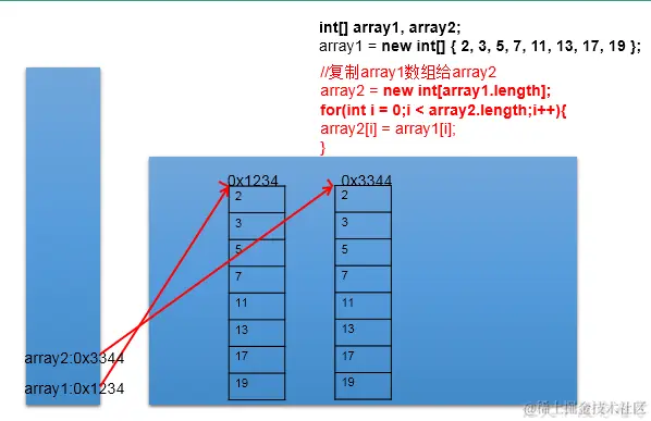 如何理解:我们通过new的方式,给array2在堆空间中新开辟了数组的空间。将array1数组中的元素值一个一个的赋值到array2数组中。