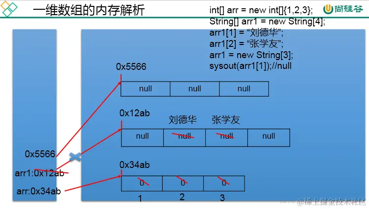 - 针对于初始化方式一:比如:int[][] arr = new int[4][3];