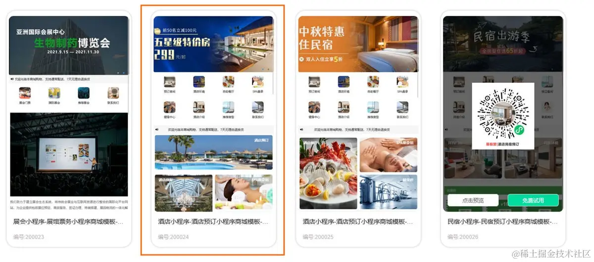 step1, 在「易极赞」的小程序模板中,选中民宿订房小程序模板,一键即可生成发布自己的品牌设计小程序
