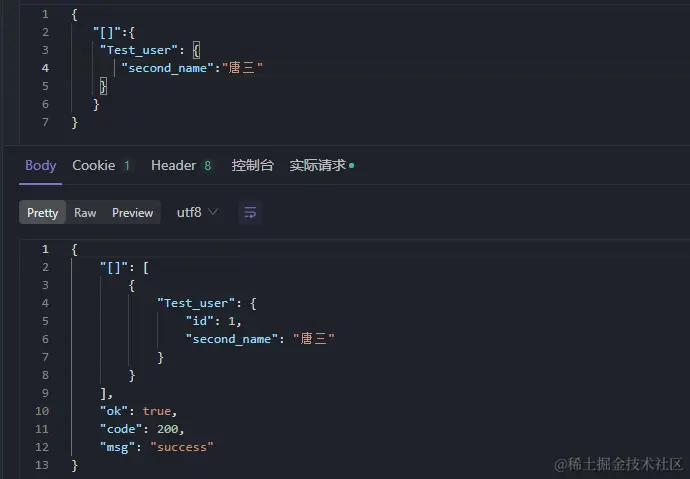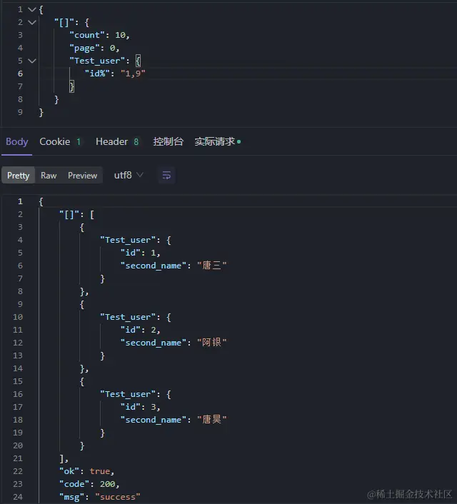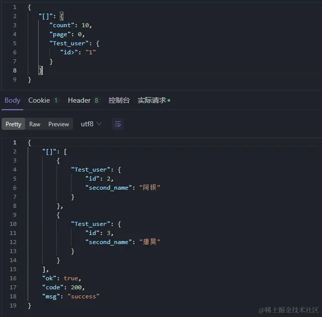 单表查询返回多条数据,用 Test_user 做示例,请求格式如下,