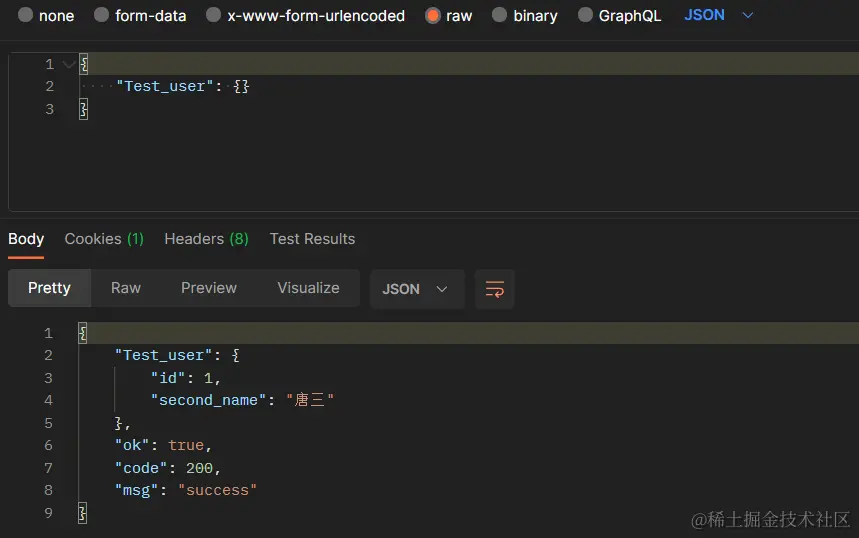 单表查询返回一条数据,用 Test_user 做示例,请求格式如下,