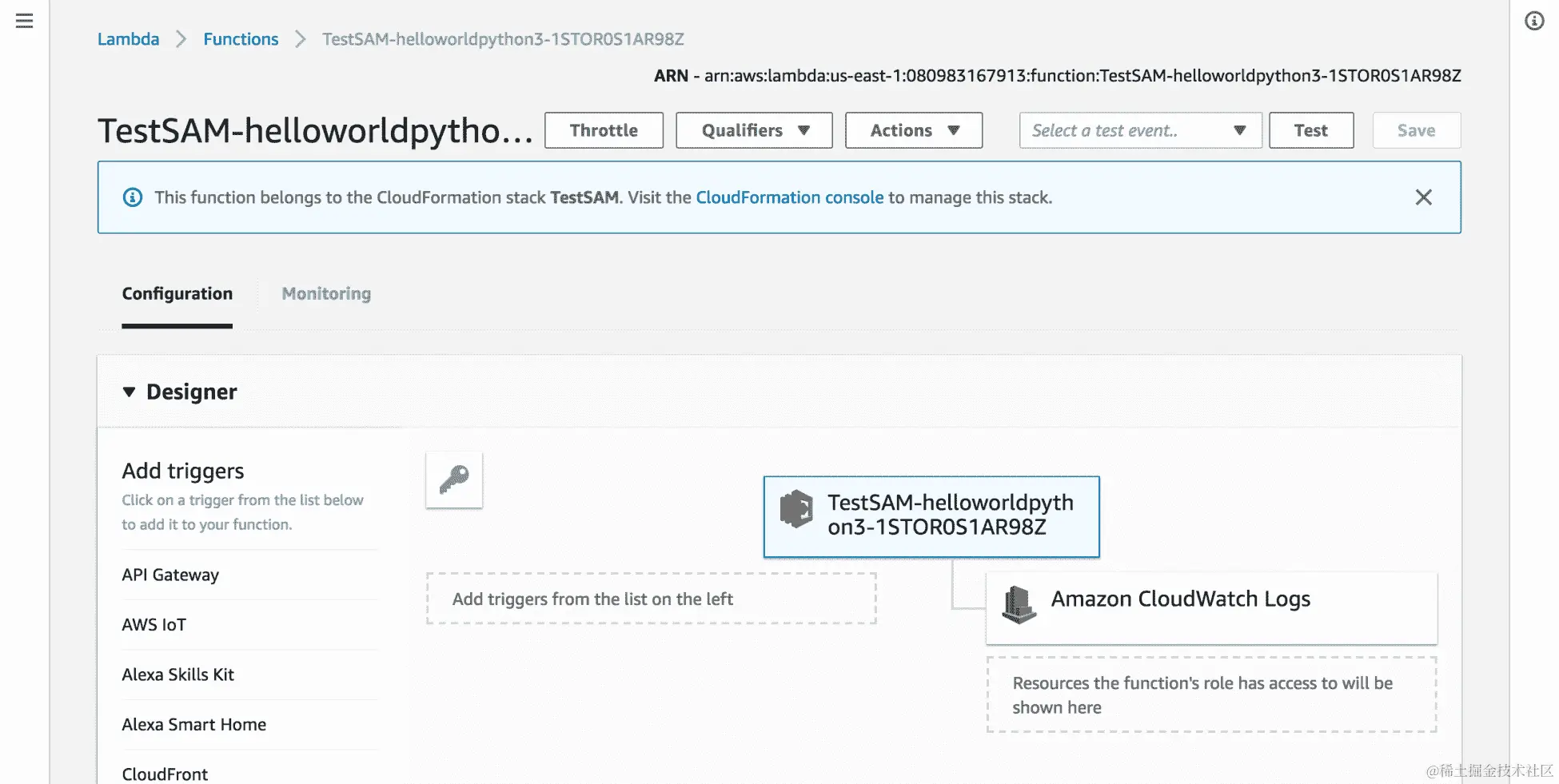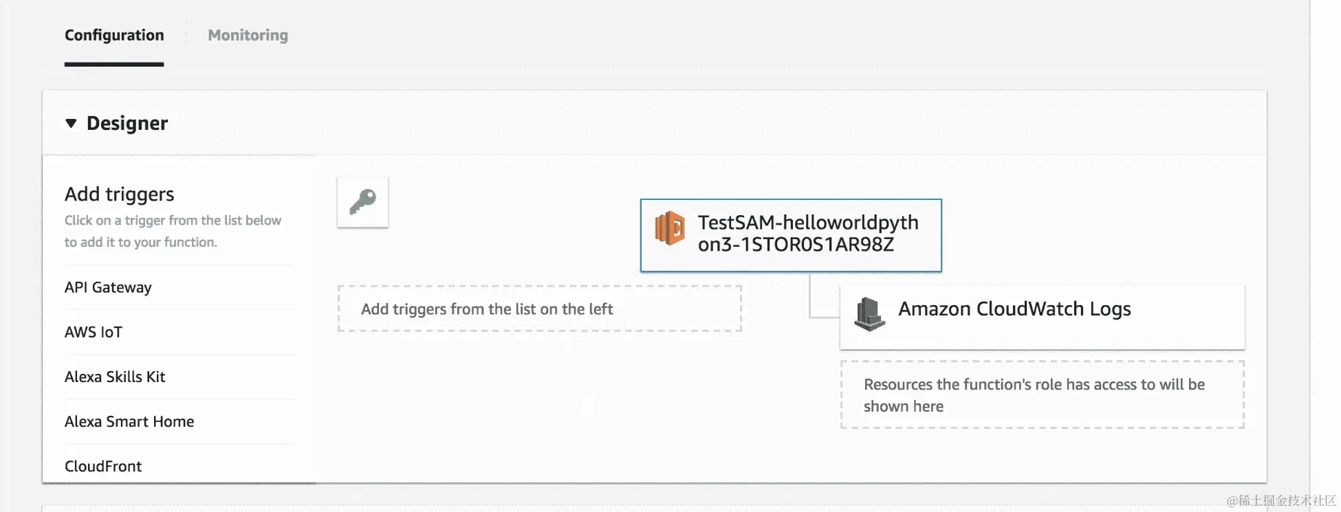 - 现在,让我们逐个逐个地了解 Lambda 函数的每个组件。配置显示了我们 Lambda 函数的触发器和日志记录设置。我们正在记录 AWS 的 CloudWatch 服务:
