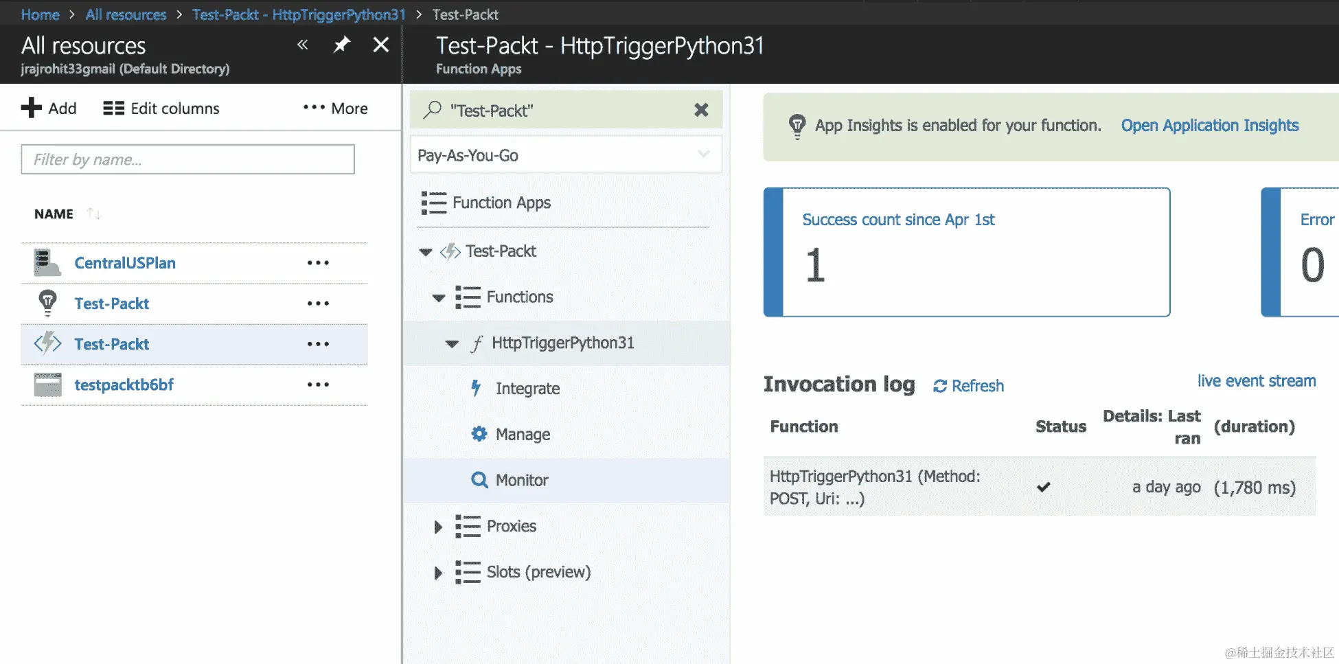 - 通过单击函数下的 Monitor 选项,我们可以访问特定 Azure 函数的监视套件: