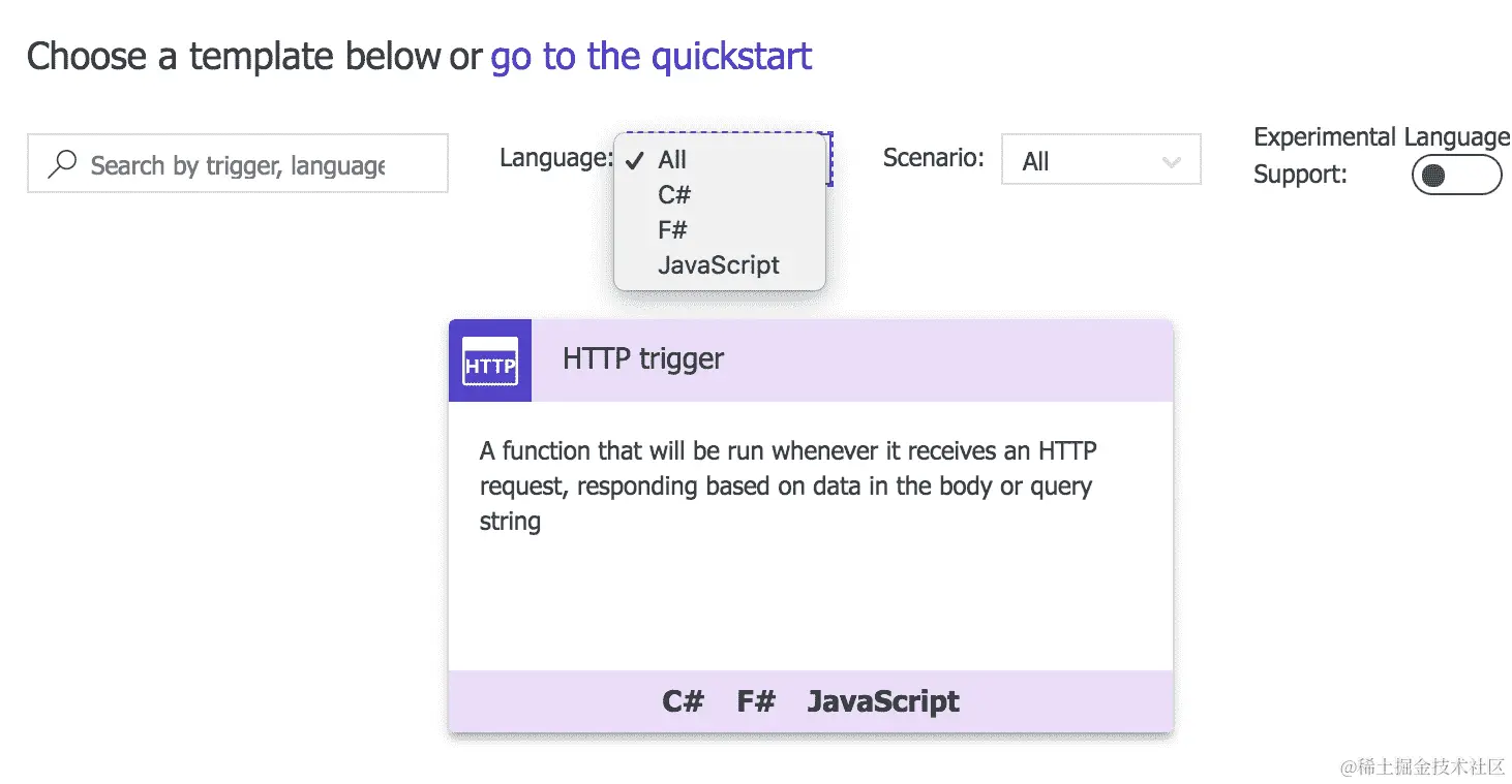 - Microsoft Azure Functions 对 Python 的支持不像 AWS Lambda 那样广泛。它们有一组非常有限的基于 Python 的触发器。因此,在决定使用 Microsoft Azure Functions 之前,开发人员需要牢记这一点。Microsoft Azure Functions 支持的语言有 C#、F#和 JavaScript: