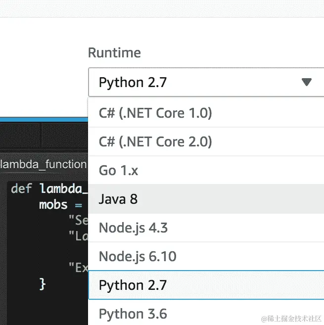 index.handler是我们的函数代码所在的文件。Handler是我们 Lambda 逻辑编写的函数的名称。此外,Runtime是用户定义的。您可以从 AWS Lambda 支持的所有可用语言中进行选择。本书的范围仅限于 Python 语言,因此我们将坚持使用其中的一个 Python 版本: