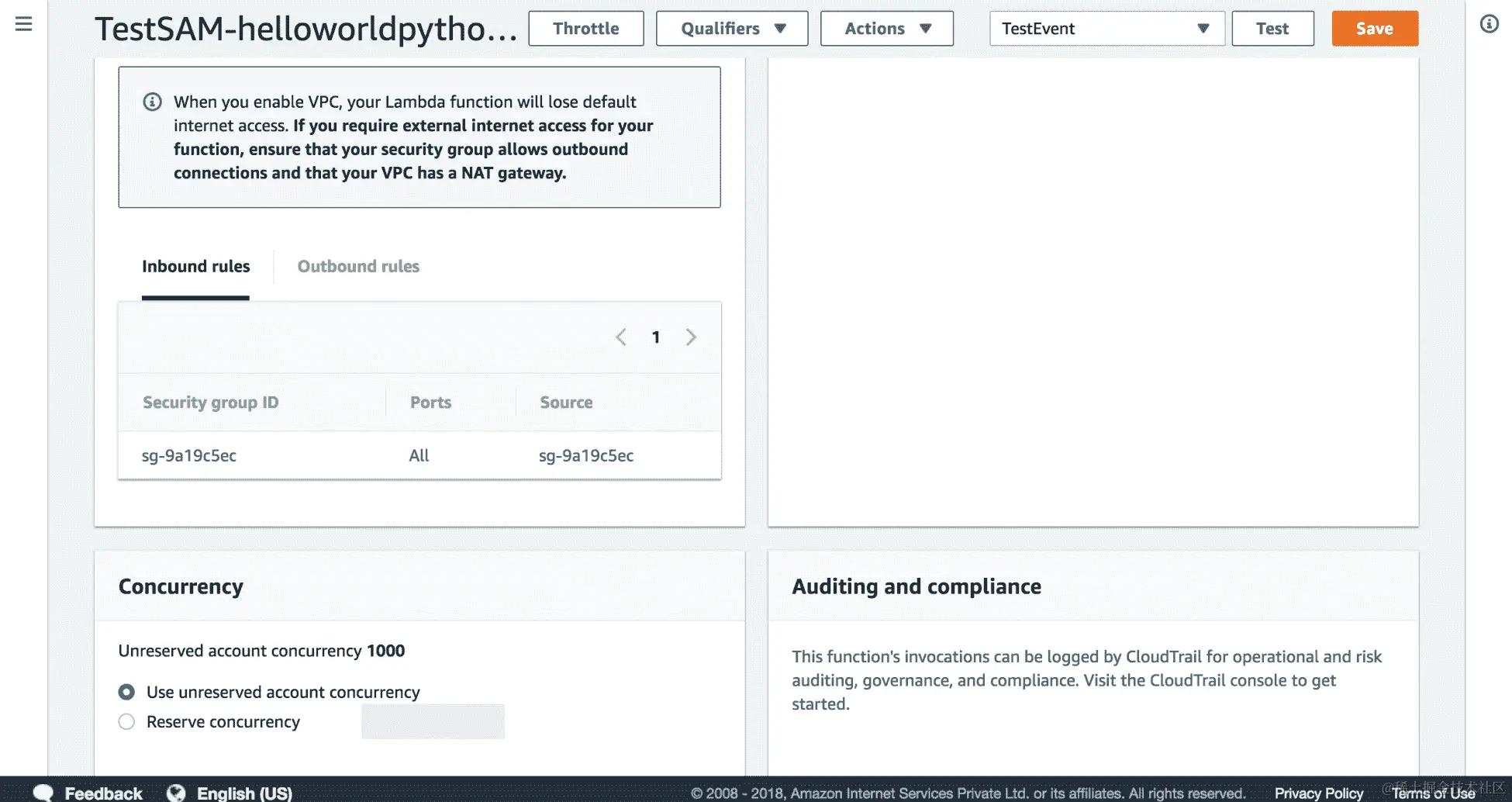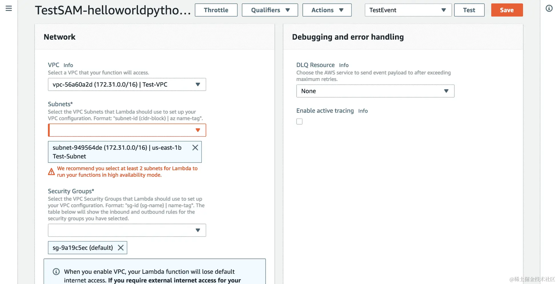 - 您可以滚动到 Lambda 控制台的底部,查看网络和安全设置,其中提到了 VPC 和子网的详细信息: