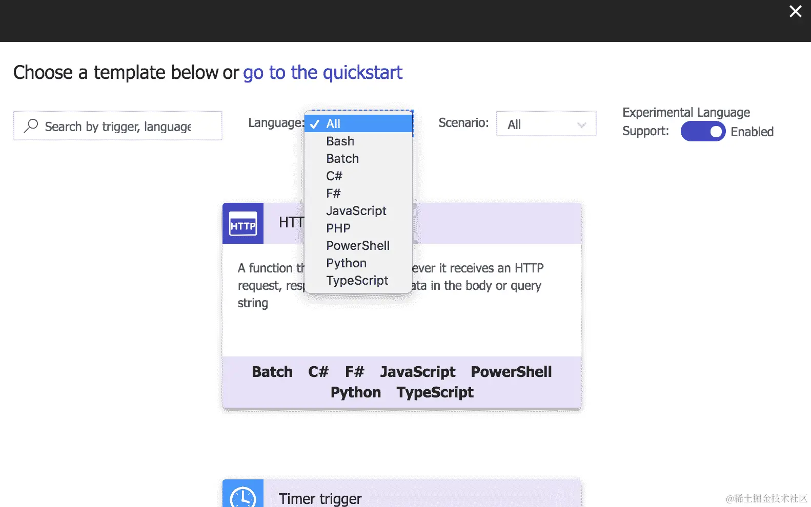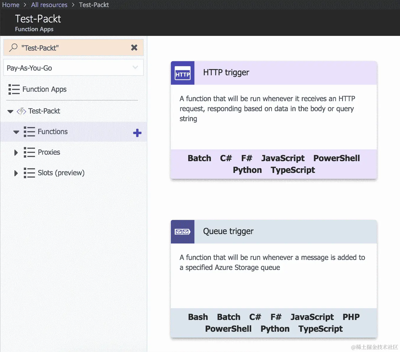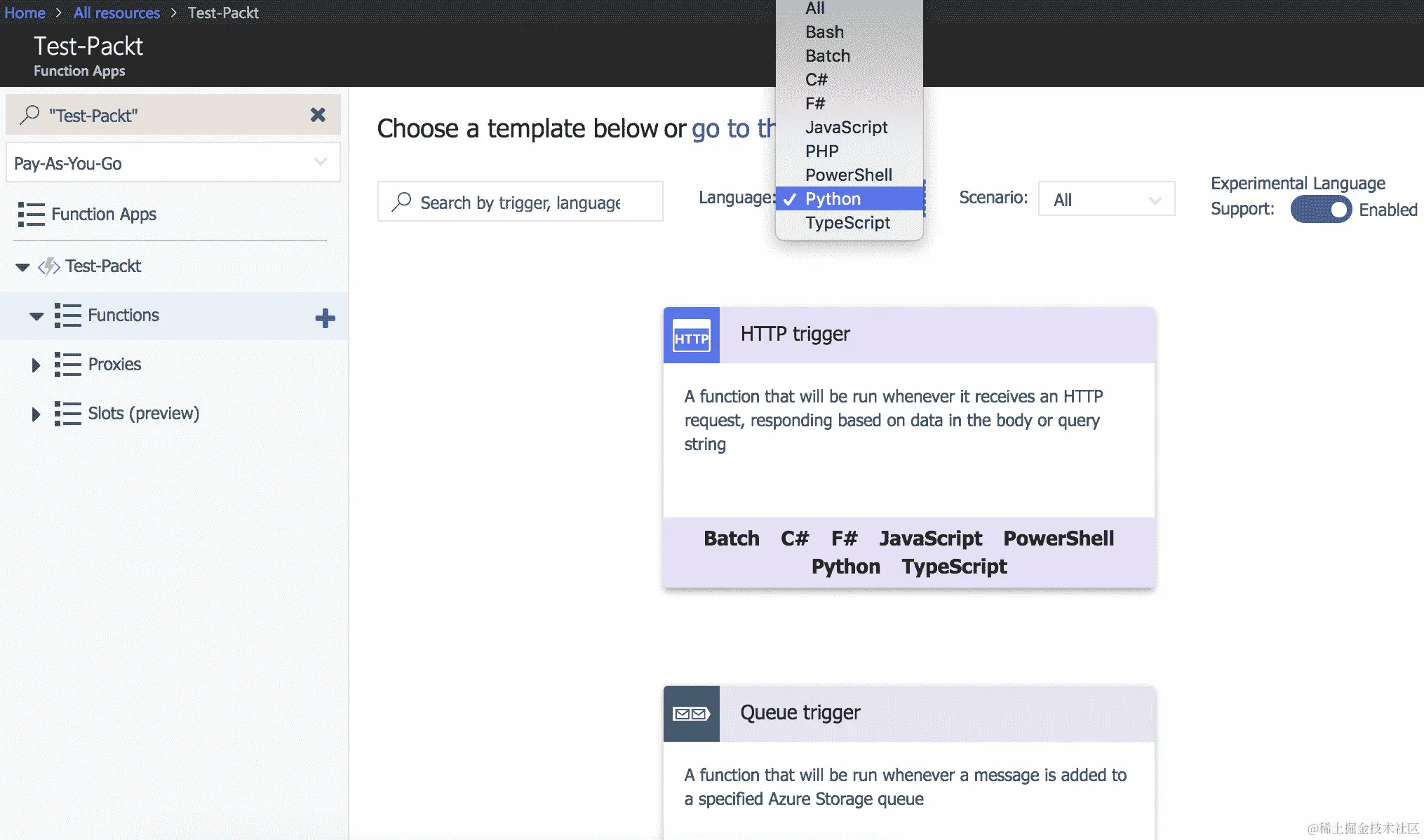 - Microsoft Azure Functions 支持的实验性语言包括 Bash、Batch、PHP、TypeScript、Python 和 PowerShell: