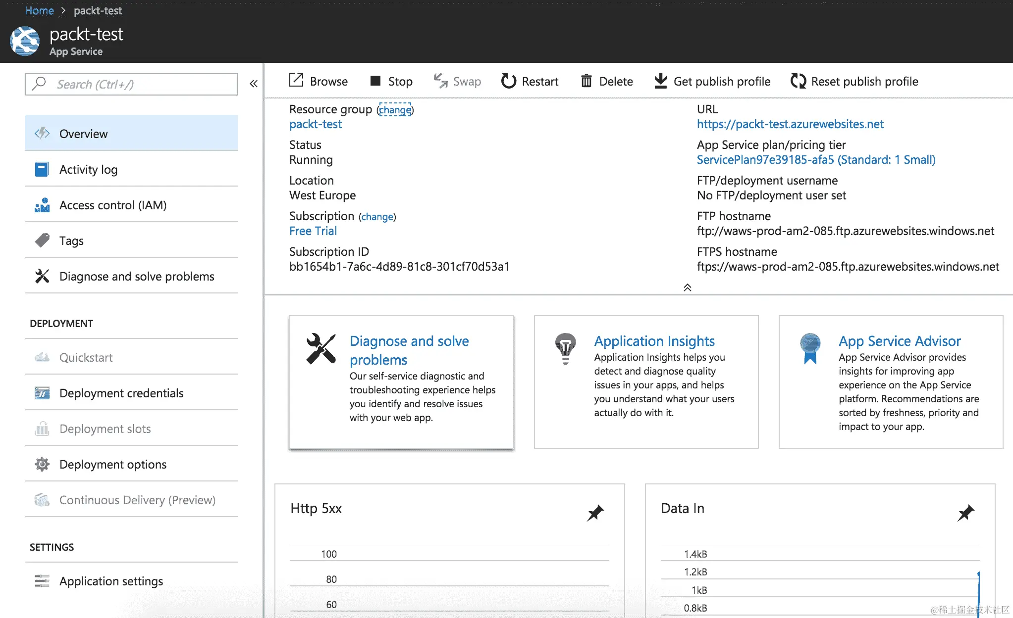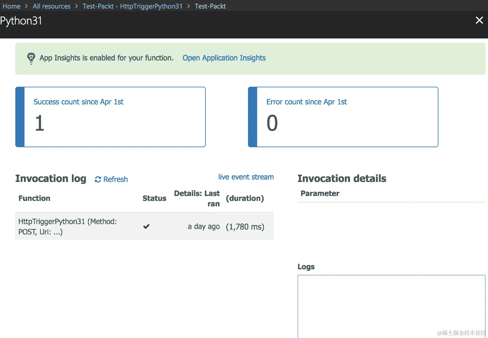 - 现在,单击菜单顶部的 Open Application Insights 选项。这将带您到详细的监视页面: