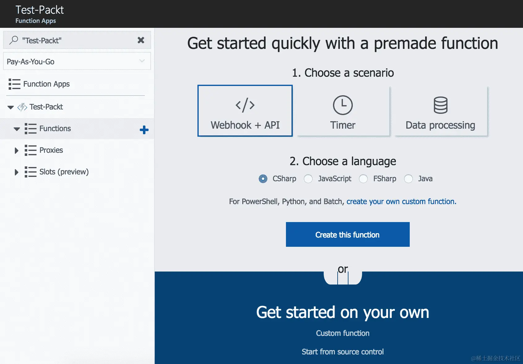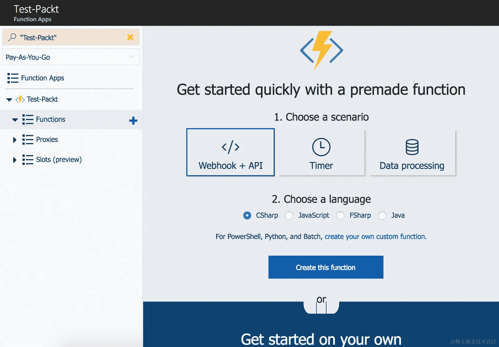 - Azure 对 Python 的支持并不多。因此,在这个控制台中,让我们选择自定义函数。在底部的 Get Started on your own 选项下,单击 Custom function: