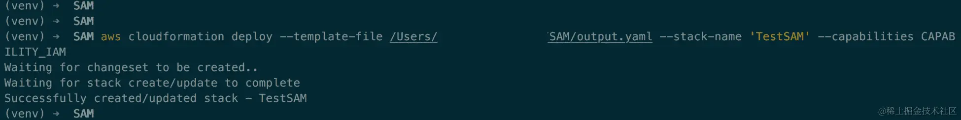 aws cloudformation deploy --template-file /Users/<path>/SAM/output.yaml --stack-name 'TestSAM' --capabilities CAPABILITY_IAM