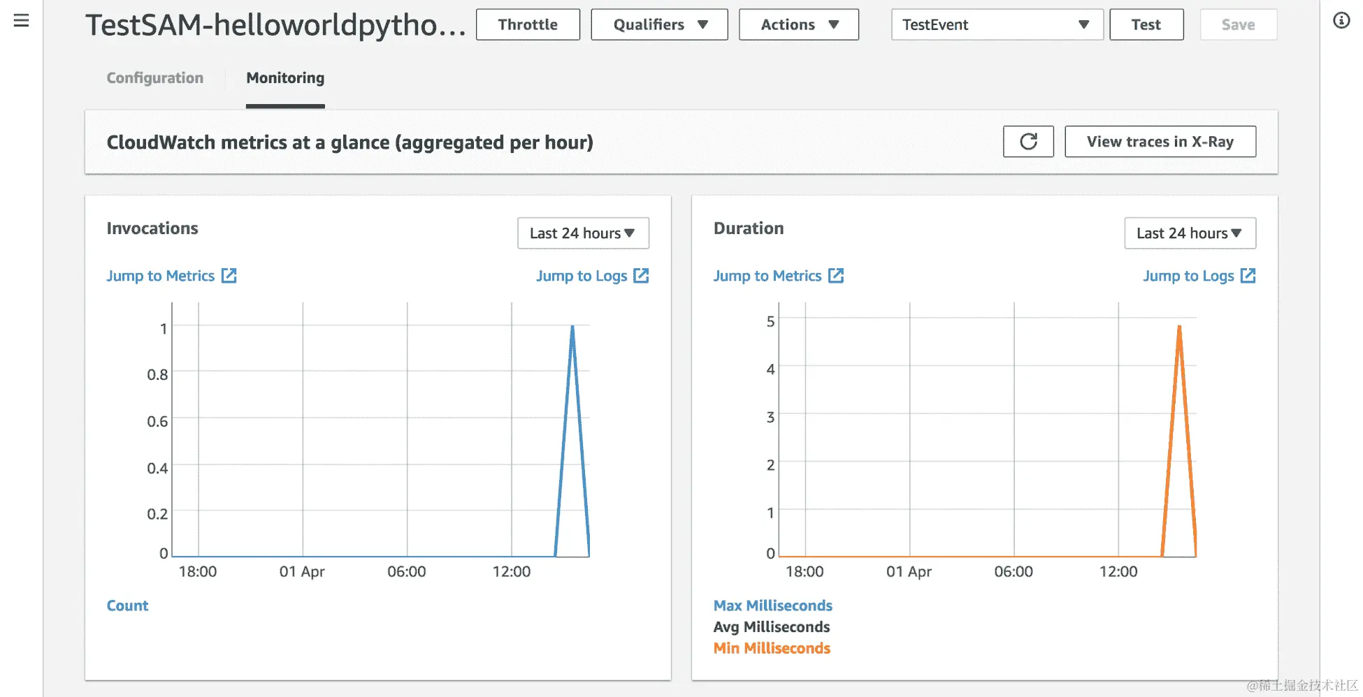 - 在 Lambda 控制台的“监控”选项中,我们还可以看到调用指标。我们可以看到确切的一个 Lambda 调用: