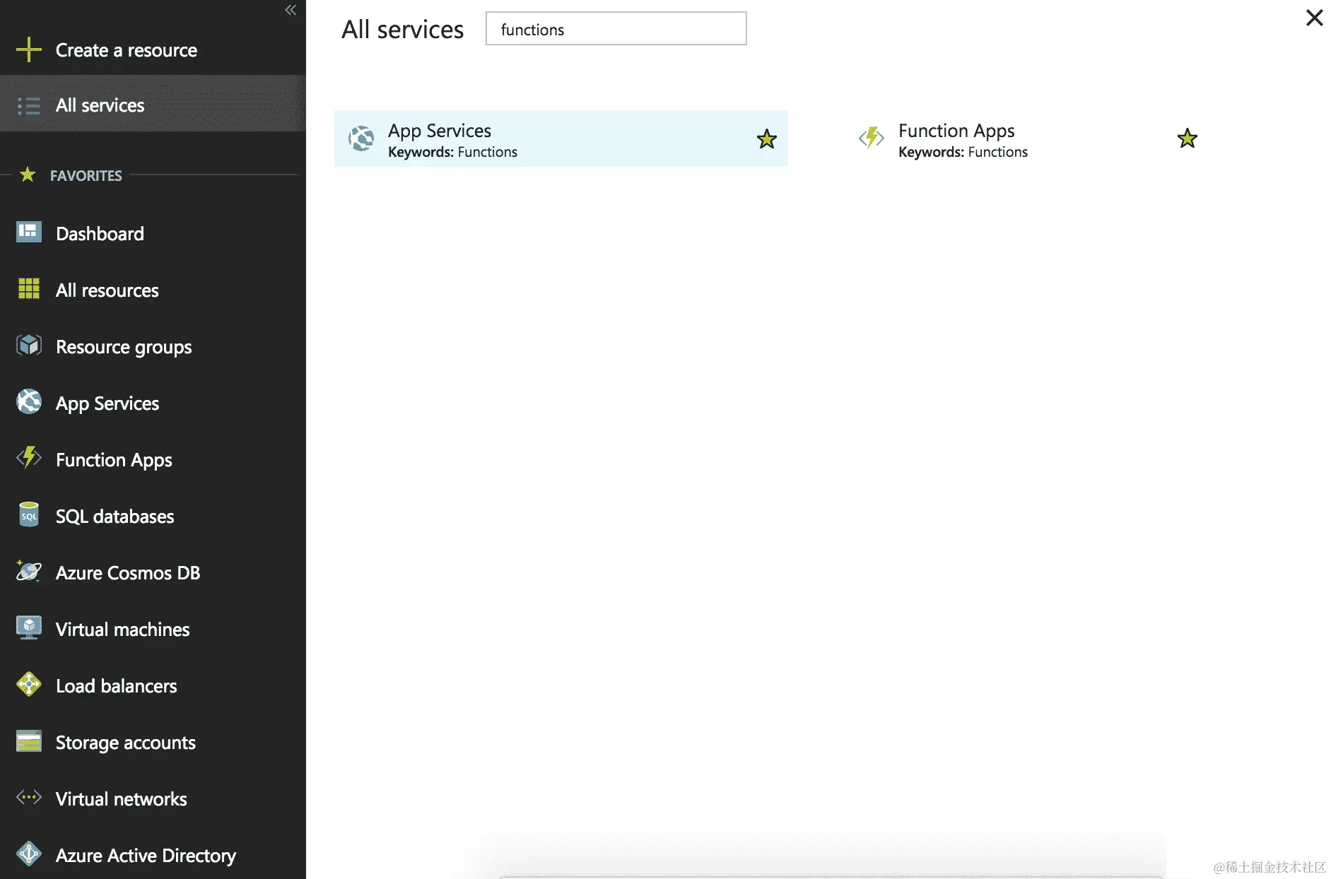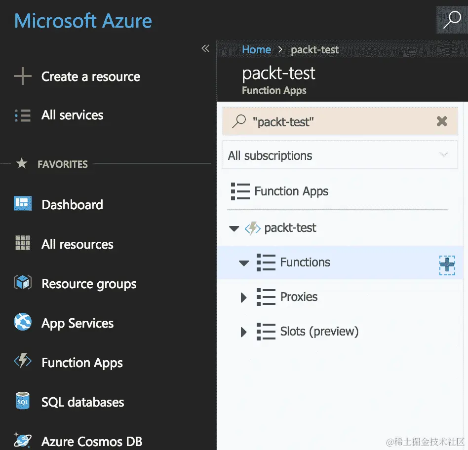 - 您可以通过导航到左侧菜单上的“所有服务”选项卡并键入函数过滤器来找到 Azure Functions 应用。您现在会注意到 Microsoft Azure Function 的服务名称下有“函数应用”: