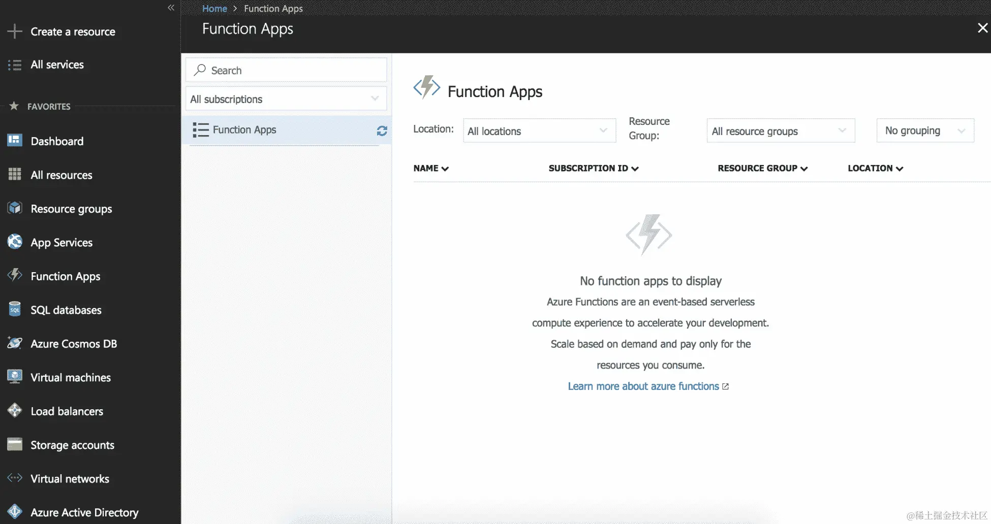 - 点击后,您将被重定向到函数应用控制台。如果您还没有创建任何函数,现在它将是空的。控制台的外观将类似于这样: