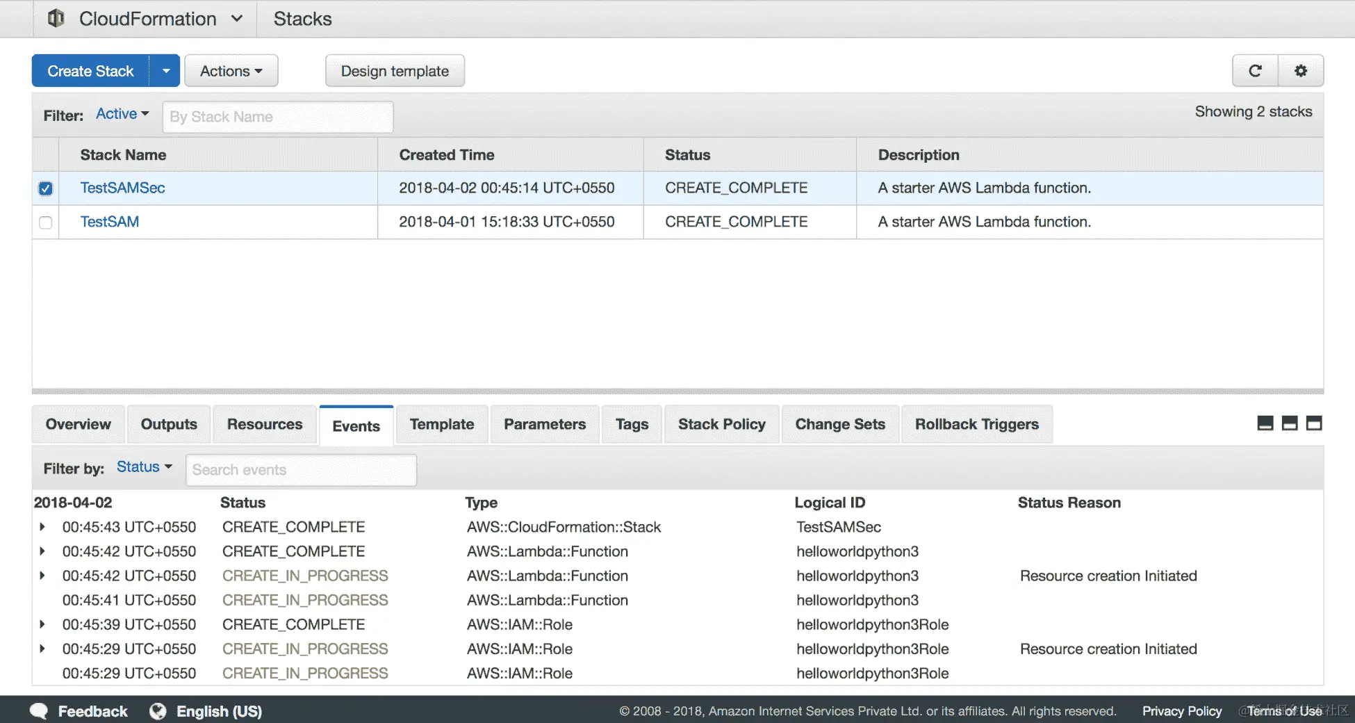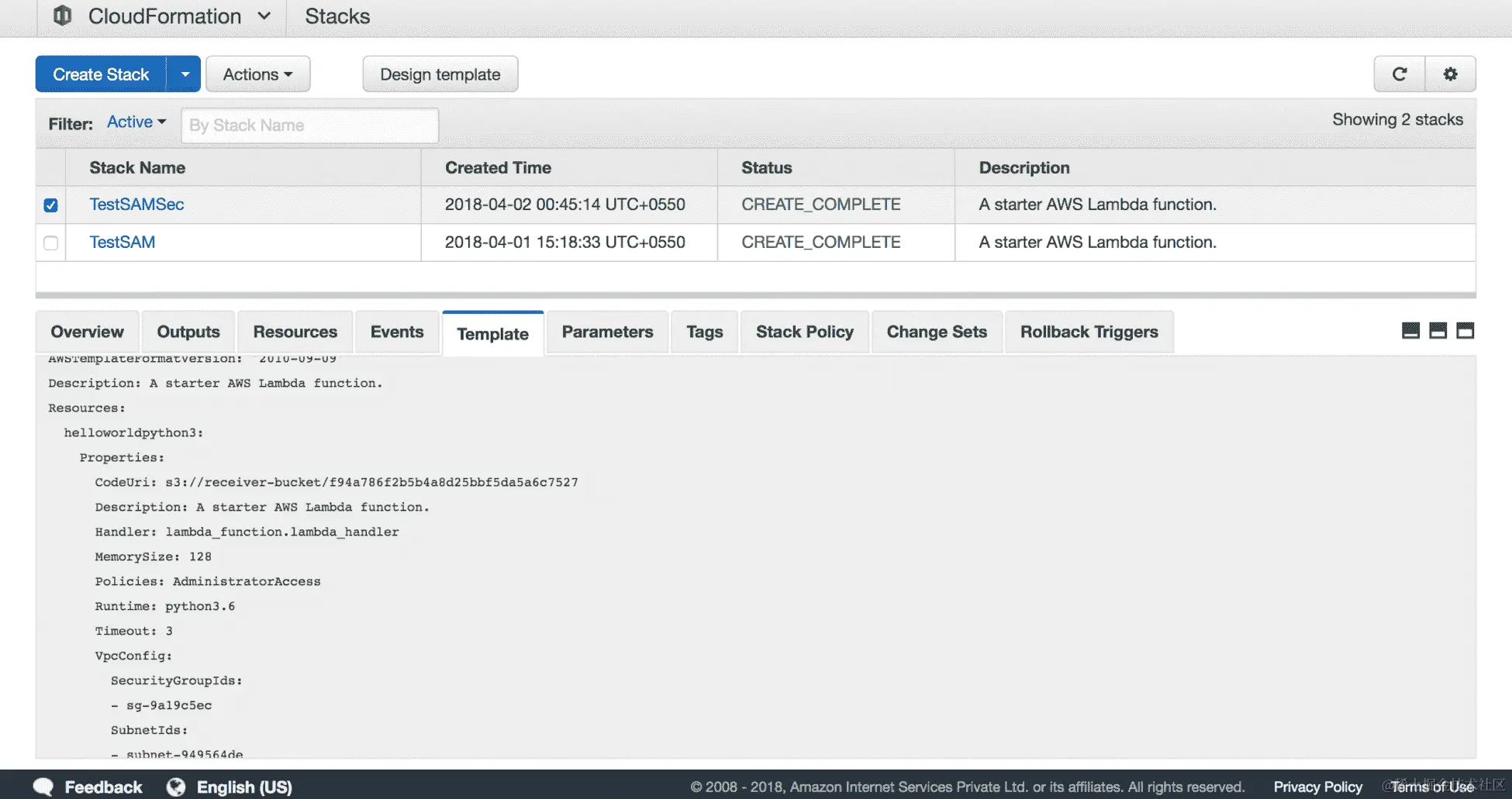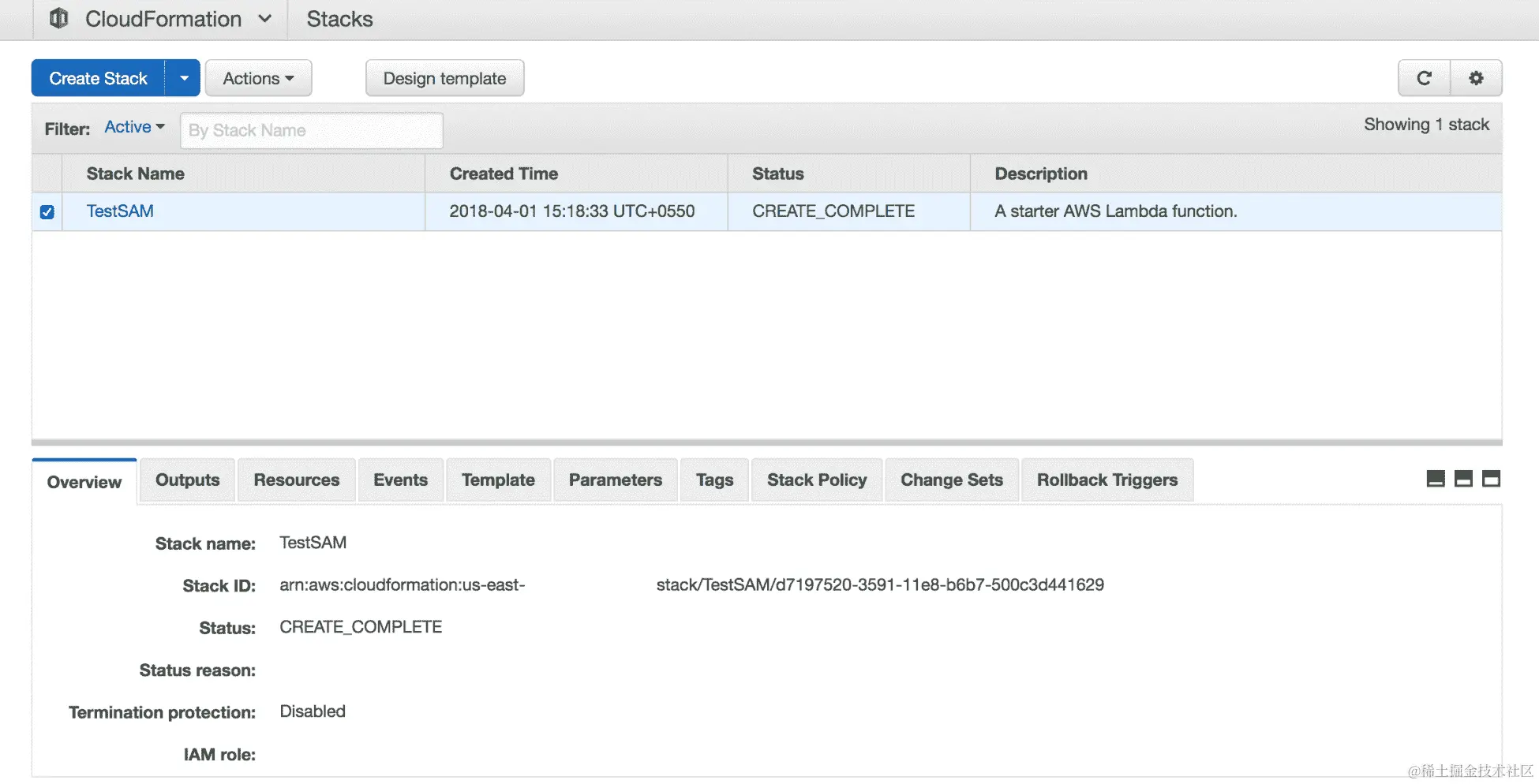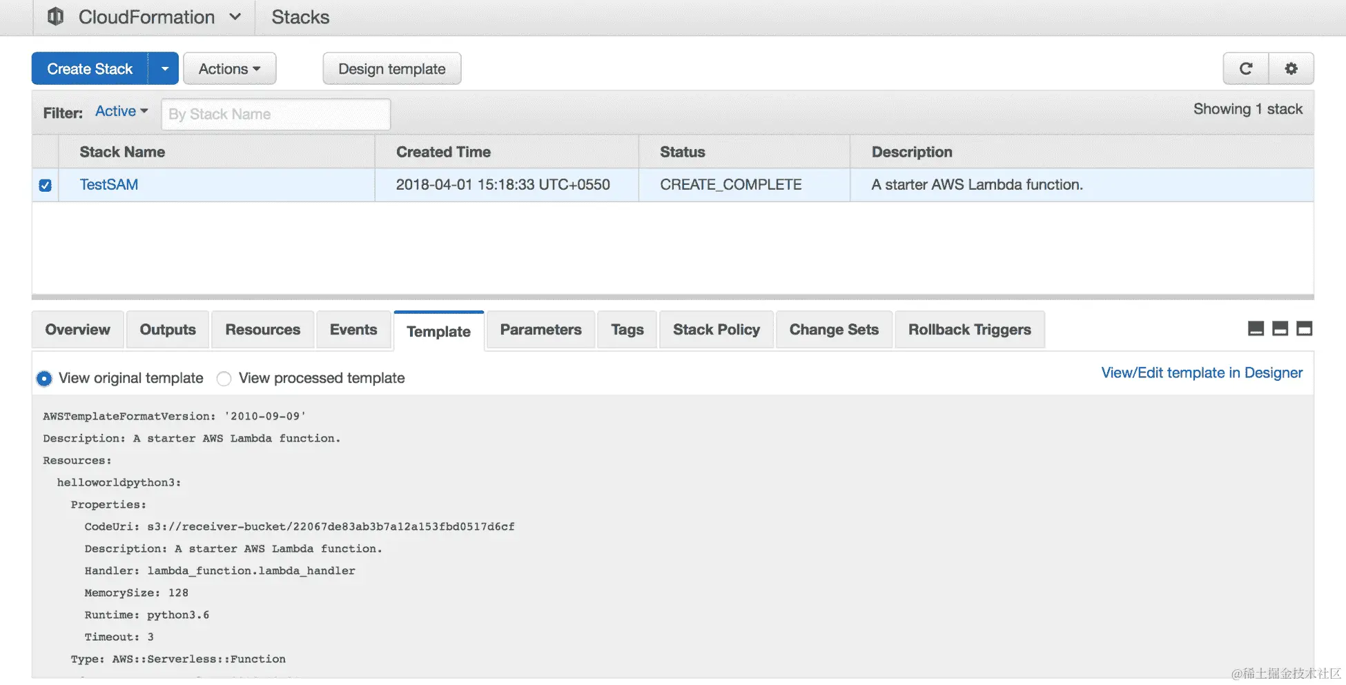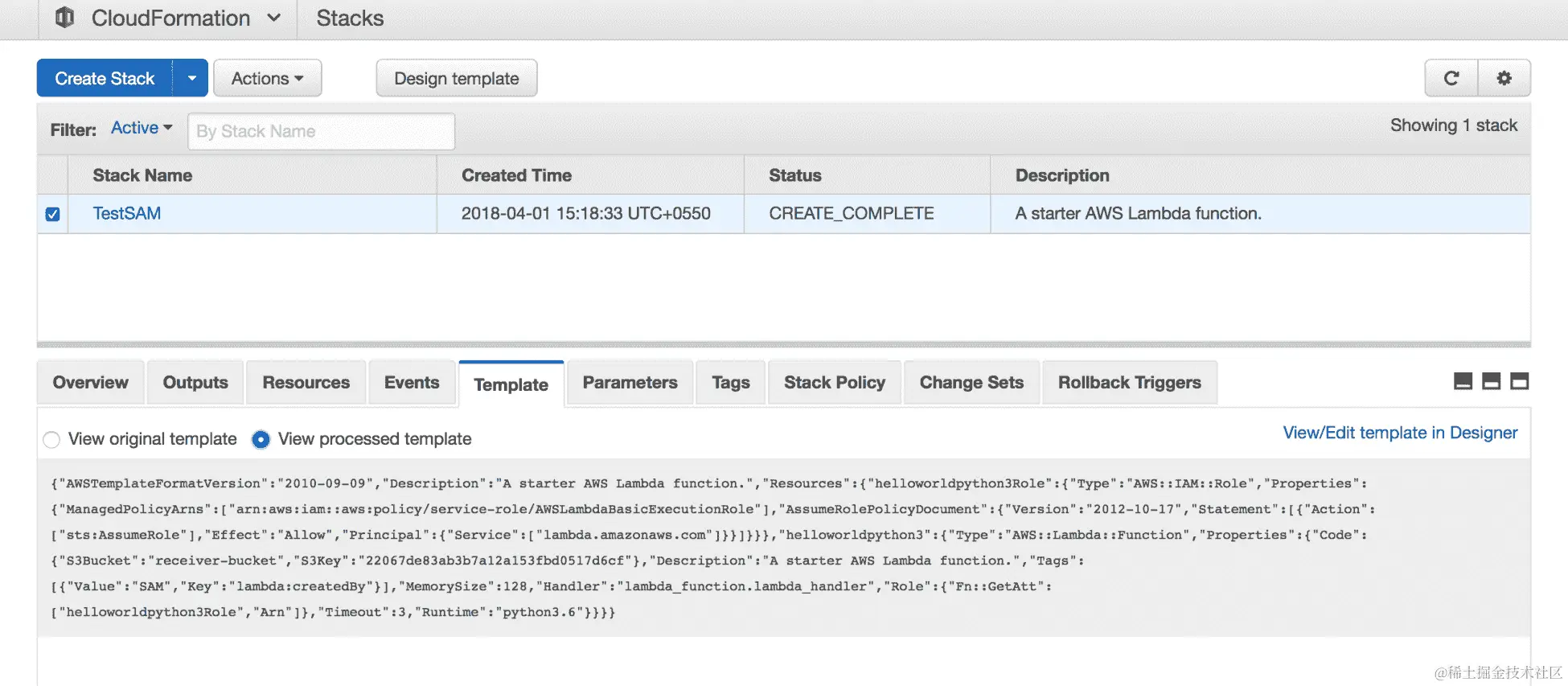 - 我们可以转到 CloudFormation 控制台,查看我们刚刚部署的模板。部署的模板将看起来像这样: