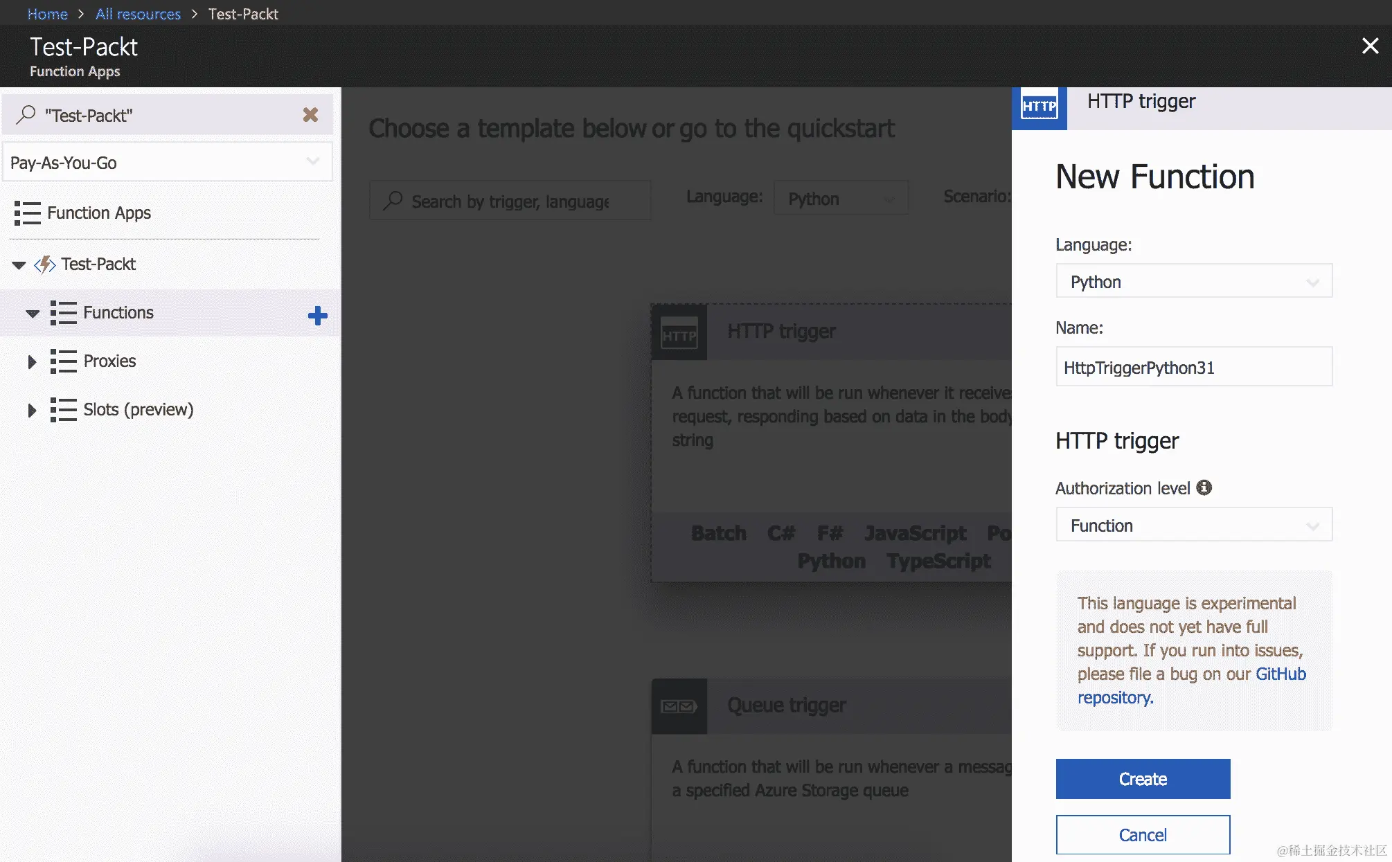 - 在函数创建向导中,启用右侧菜单中的实验性语言选项。现在,您将能够在可用语言中看到 Python 选项: