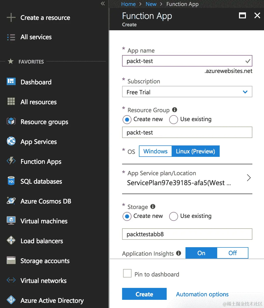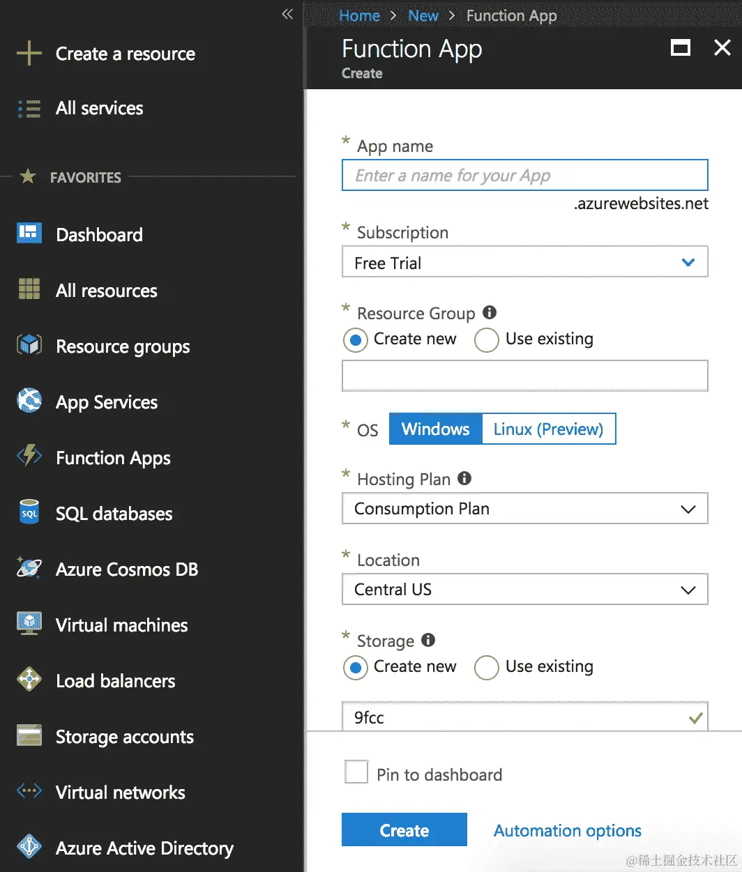 - 当您在菜单中点击“函数应用”时,您将被重定向到“函数应用”创建向导,如下截图所示: