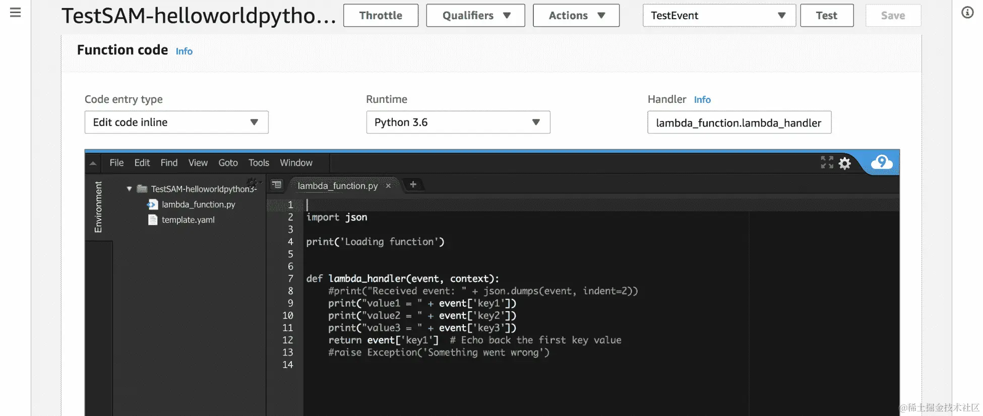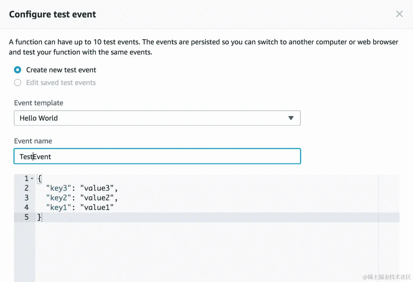- 让我们为 Lambda 函数创建基本测试。点击“测试”按钮即可打开测试创建控制台: