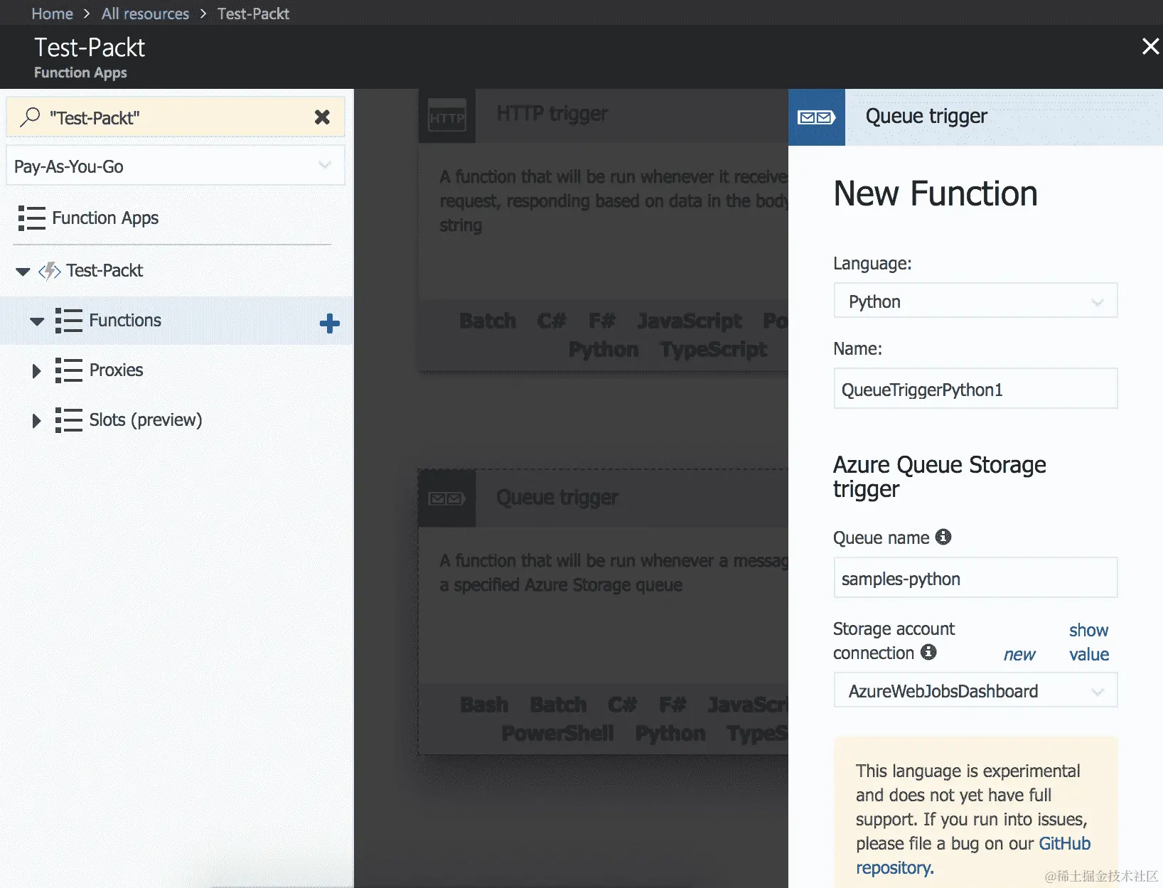- Python 语言有两个可用的触发器。一个是 HTTP 触发器,另一个是队列触发器,如下面的屏幕截图所示:
