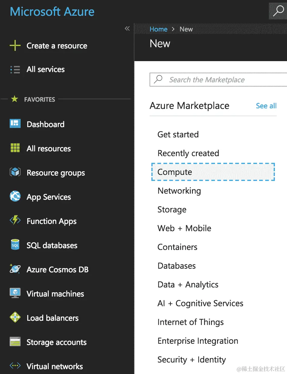 - 现在,让我们开始创建一个 Azure 函数。为此,我们需要在左侧菜单中点击“创建资源”选项,然后从列表中点击“计算”选项,然后从随后的选项列表中选择“函数应用”选项: