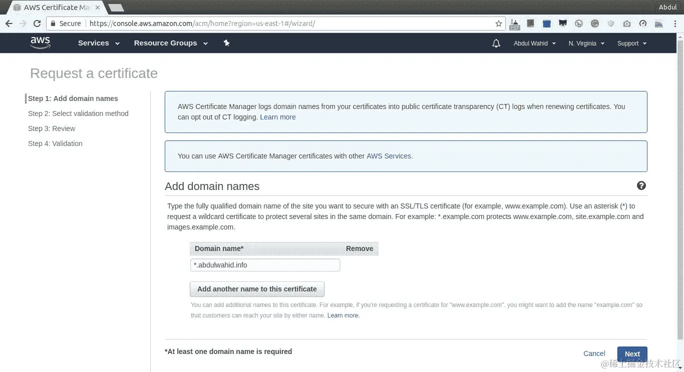 现在,我们将为我们的域和子域生成一个 ACM 证书。按照以下步骤创建 ACM 证书: