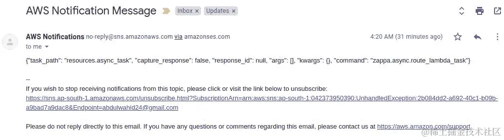 从async_task中,我们引发了一个ValueError异常。这将导致异步 Lambda 执行失败,并在随后的失败时引发 DLQ 事件。DLQ 将把异常数据处理到我们配置的 SNS 主题 ARN。最后,我们将在电子邮件中收到异常信息。