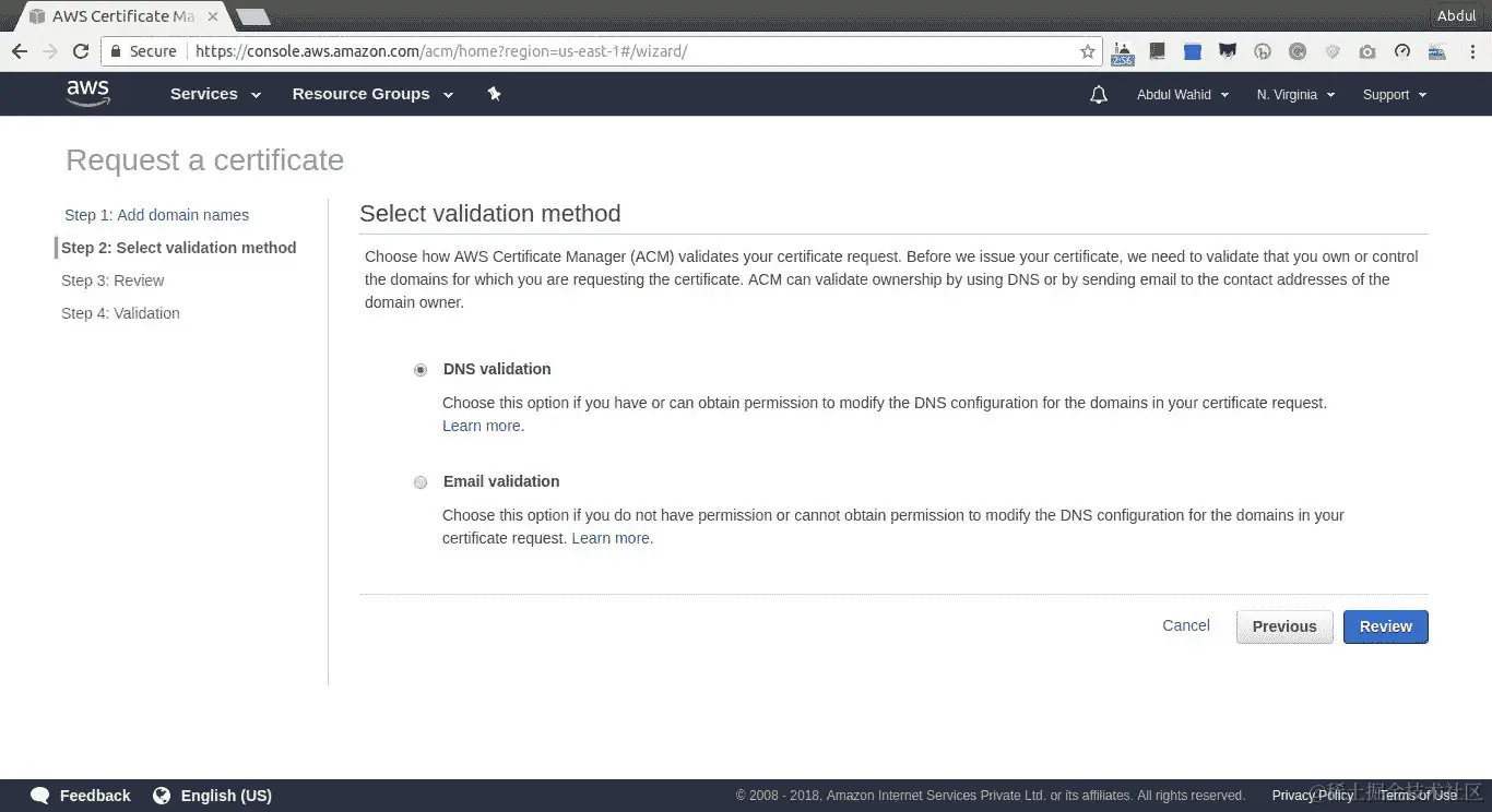 我们将使用 DNS 验证方法。这是因为我们拥有 Route 53 托管区中的 DNS 访问权限,这是因为在域名注册商处有映射的域名服务器。DNS 验证很简单。请看下面的截图:
