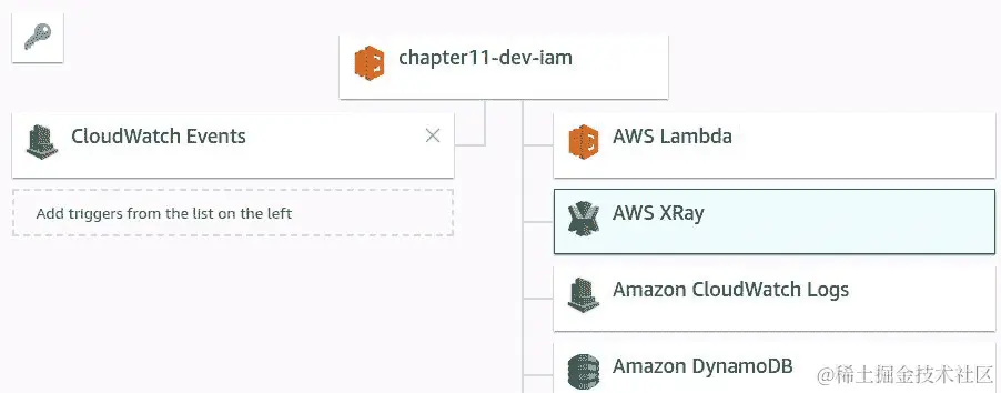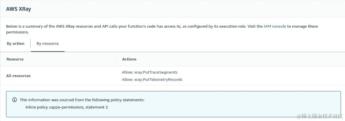一旦选择了 X-Ray,默认执行角色权限将附加到您的 Lambda 函数。这样,AWS X-Ray 将记录对 Lambda 函数 API 执行的跟踪。