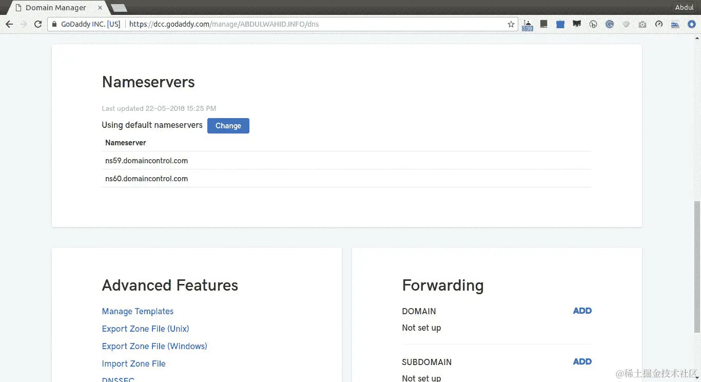 我们将把现有域的控制权转移到 Route 53。这个过程需要将域名abdulwhaid.info的默认域名服务器更改为 Route 53 创建的新域名服务器。