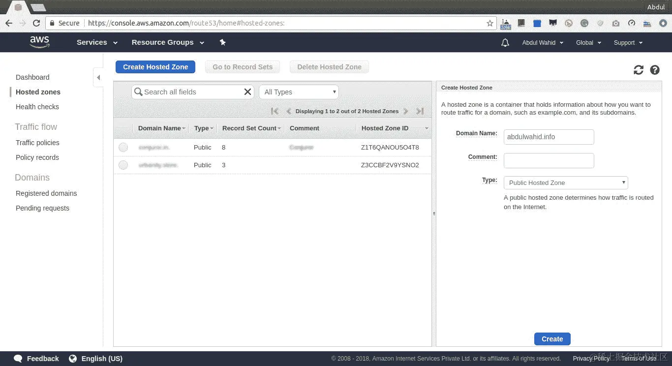 abdulwahid.info创建托管区域,如下面的屏幕截图所示: