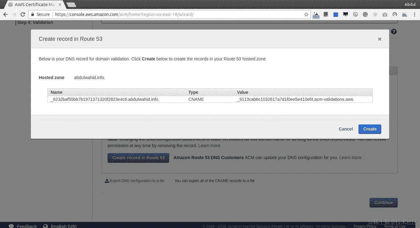 - 一旦您点击了在 Route 53 中创建记录,它将弹出一个确认弹窗,显示 CNAME 记录,如下面的截图所示: